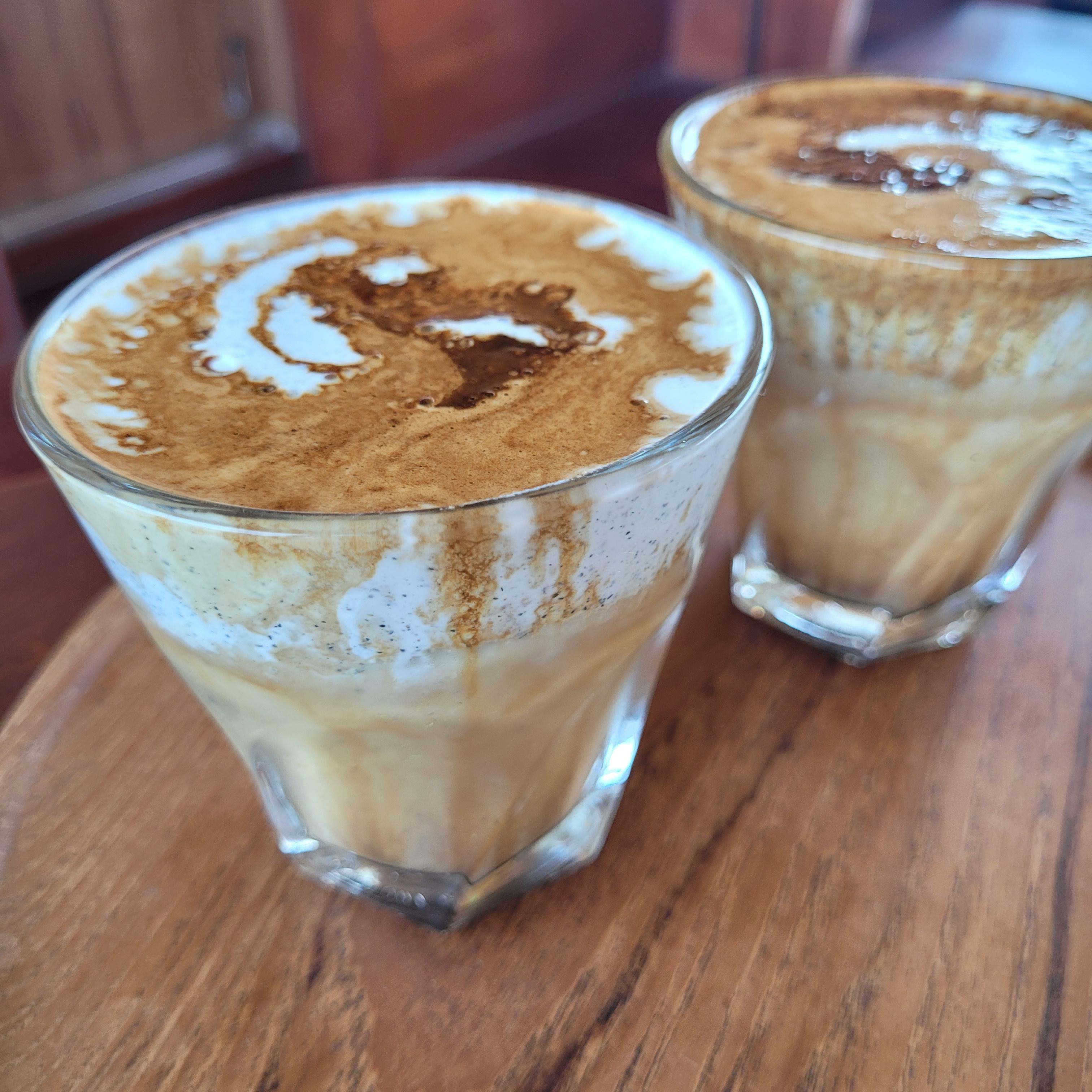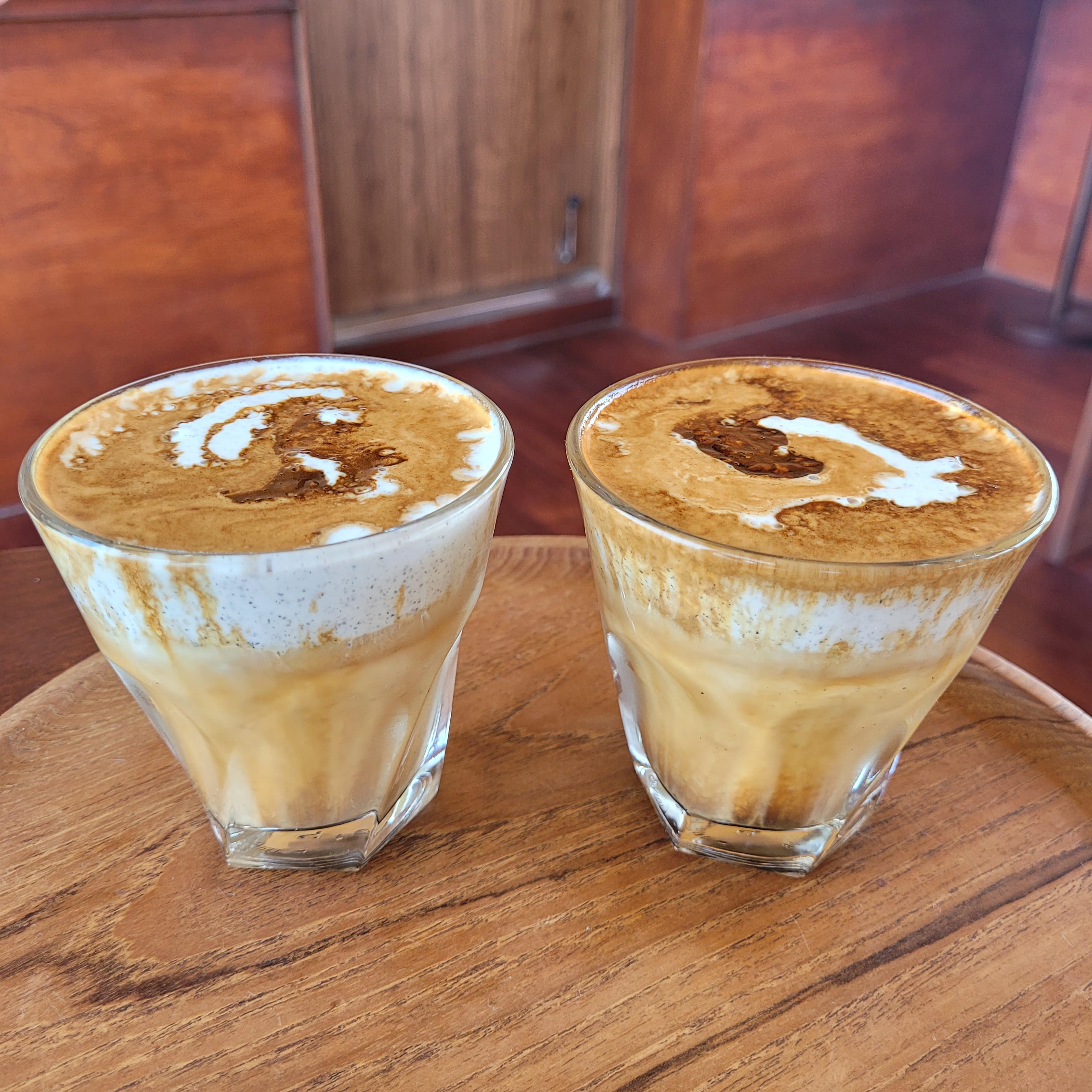 에스프레소를 크림에 조심히 따라서 커피가 다 가라앉지 않고 위에 남아있어요.
