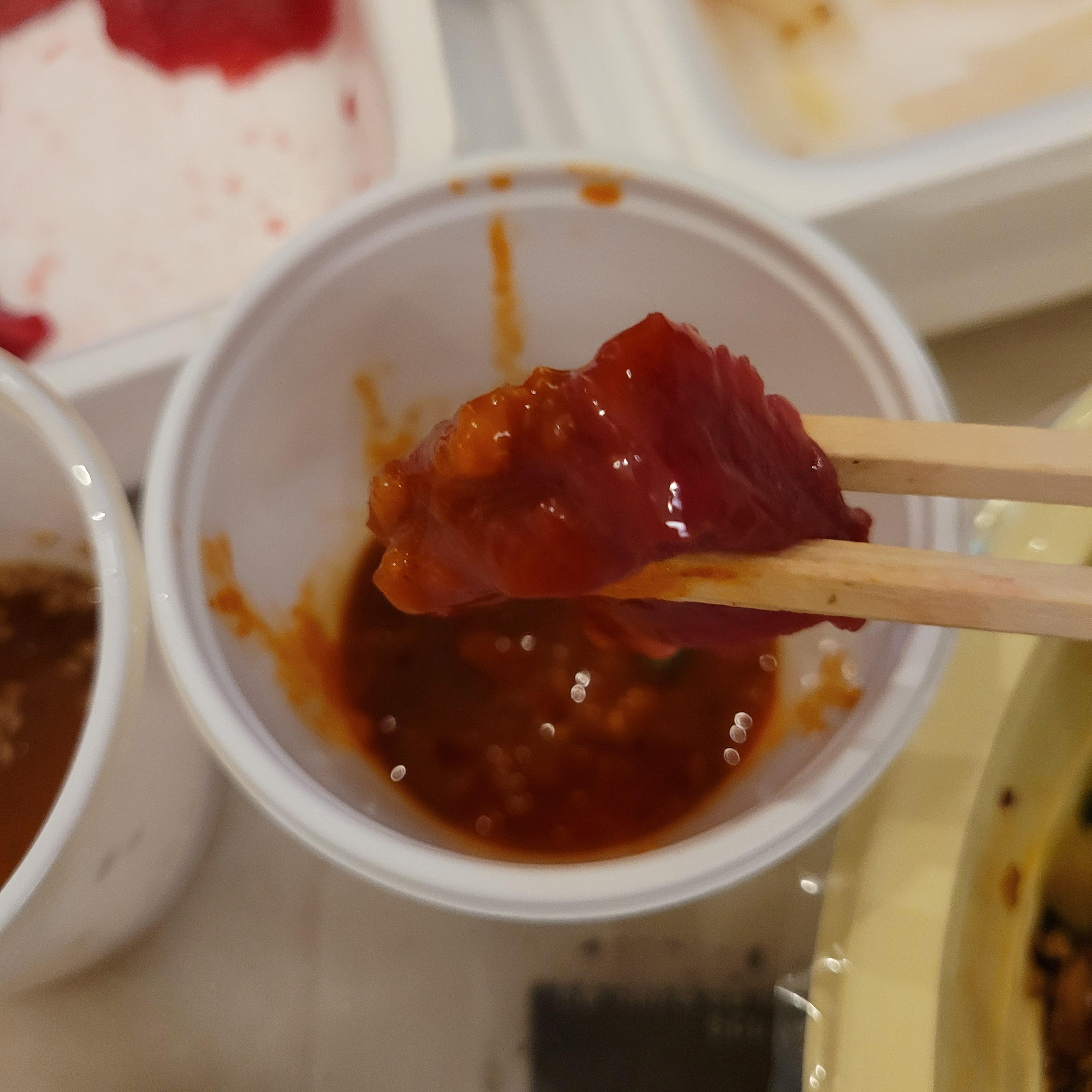 기름장과는 다른 맛이고 고추장 육회 양념 맛이에요.