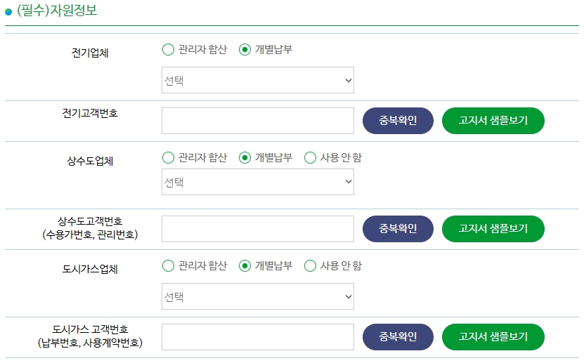 아파트나 오피스텔와 같이 관리비에 전기, 수도, 가스비 등이 포함해서 나오는 경우 주소 입력시 자동으로 자원정보가 입력됩니다.