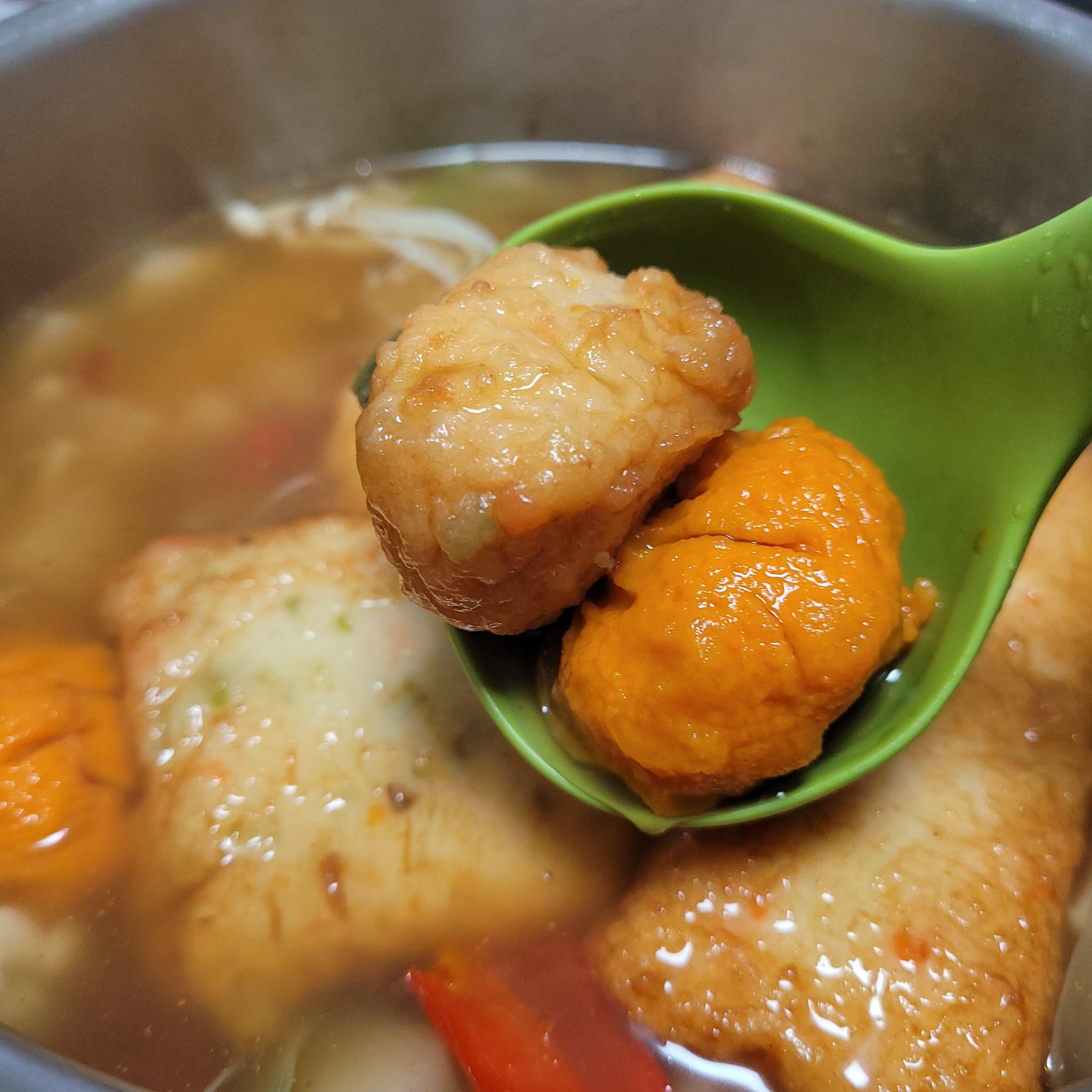 둘 다 어묵인 줄 알았는데 하나는 볼 어묵이고 빨간색은 안네 당면이 들어 가있는 어묵 주머니였어요!!
