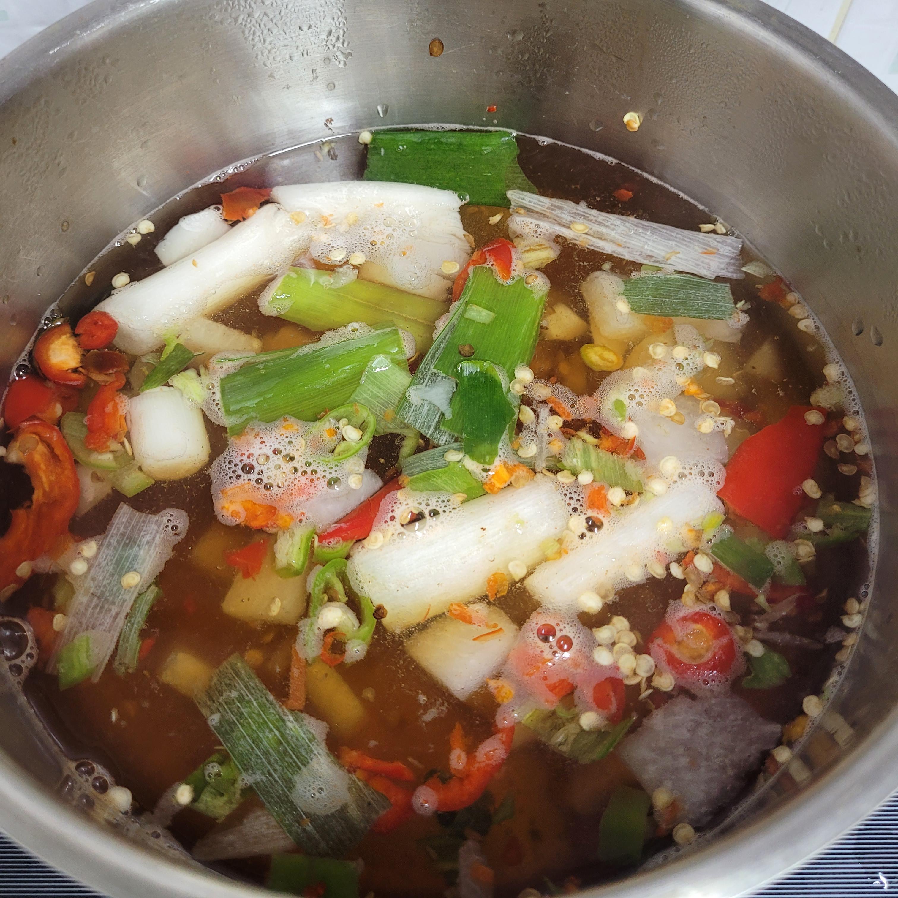2. 물, 어묵 소스, 야채 넣고 끓이기