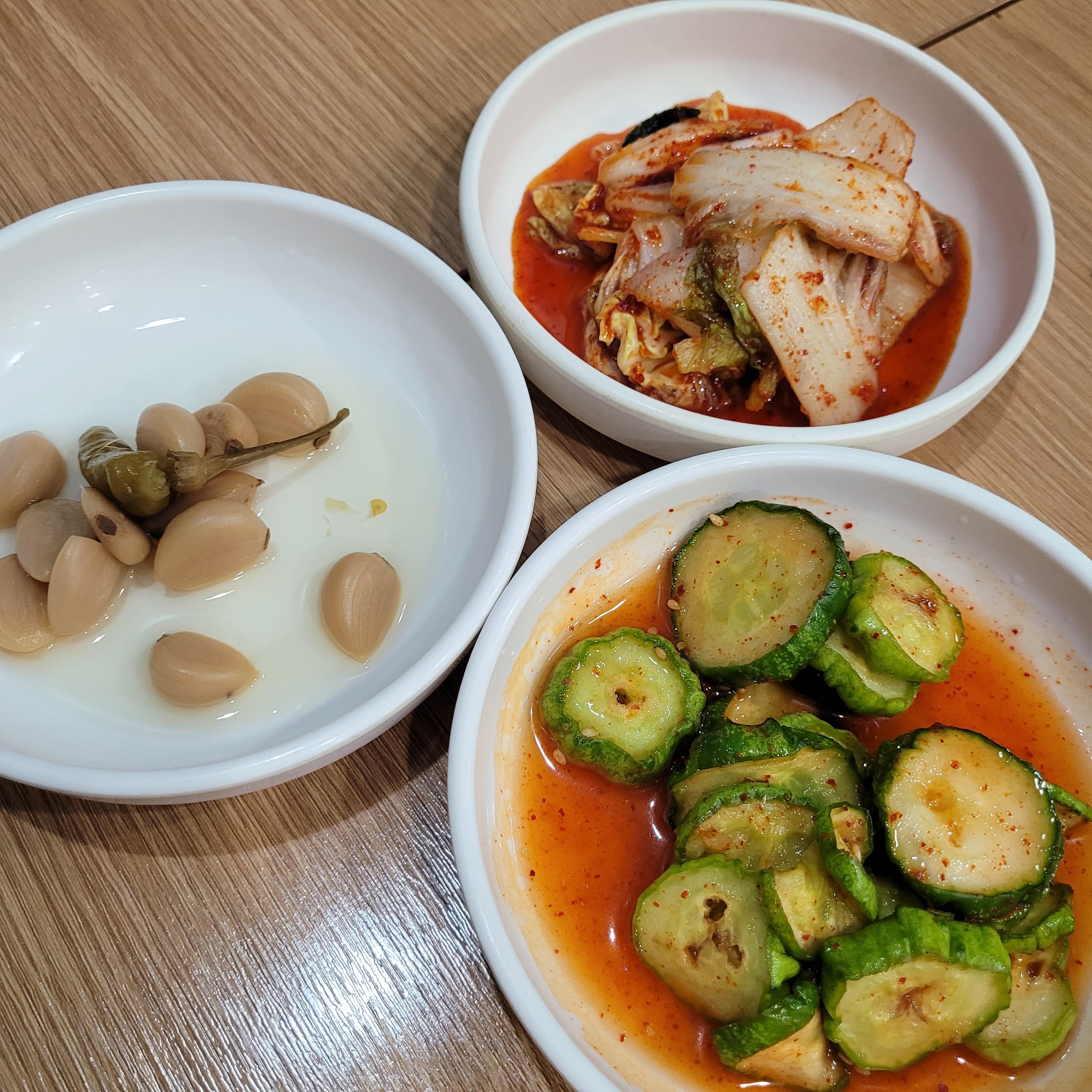 반찬 삼총사 김치, 오이무침, 마늘짱아찌
