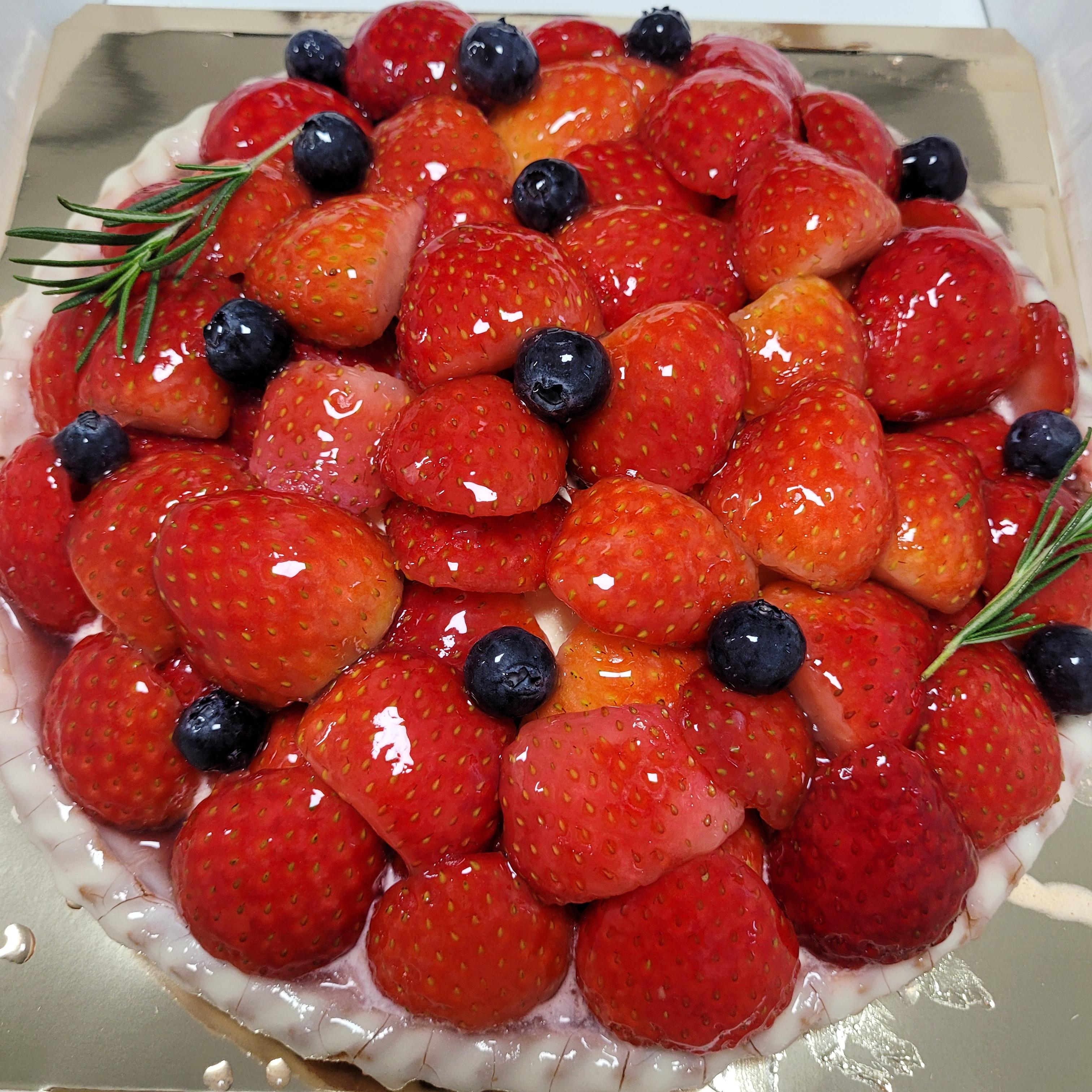 두툼한 타르트지 위에 부드러운 크림과 그 위에 틈이 보이지 않을 정도로 딸기가 듬뿍 올려져 있어요.