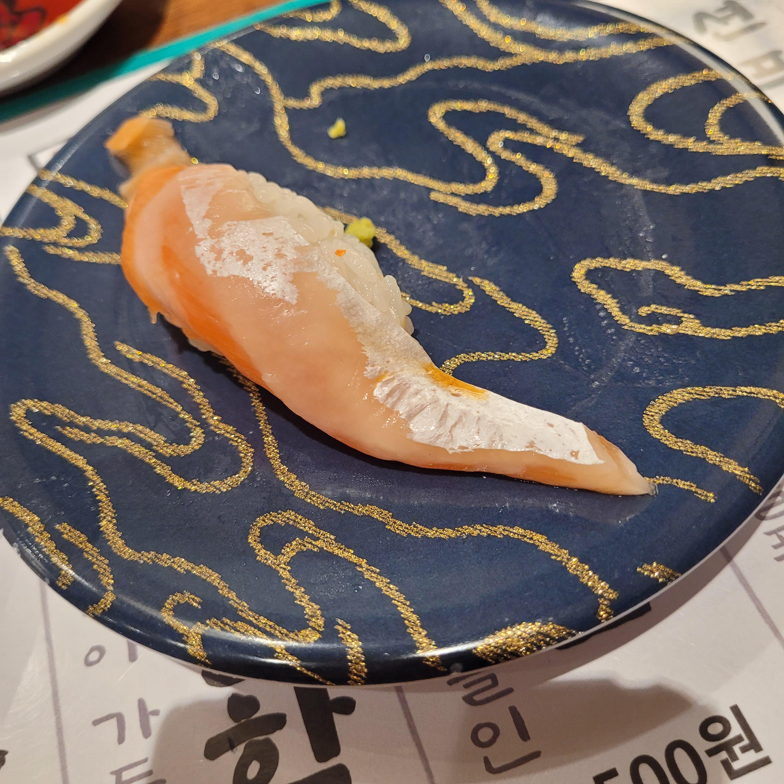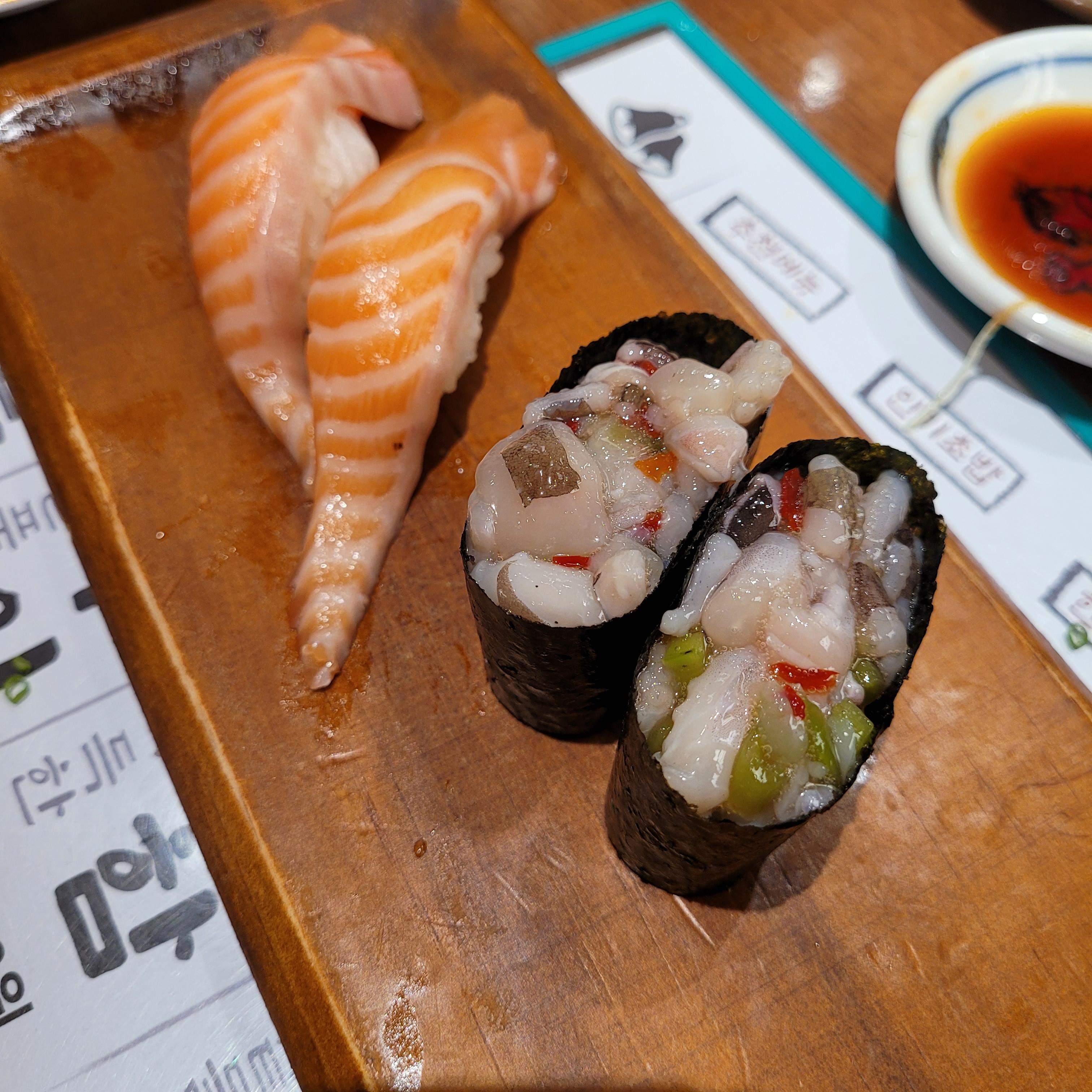 전 초밥에 소스 올라가 있는 걸 안 좋아해서 연어 뱃살이랑 연어 기본으로 2번 먹었어요.