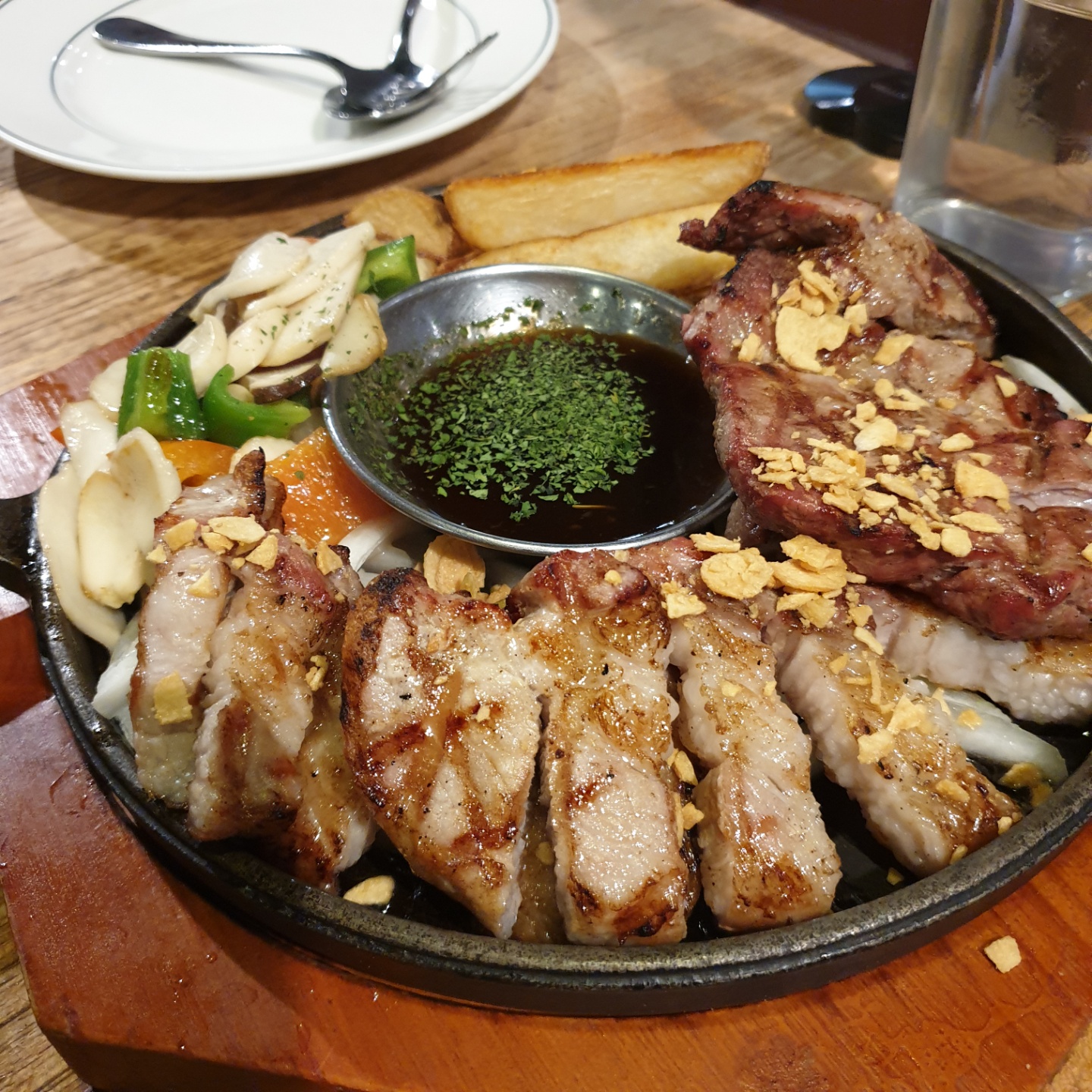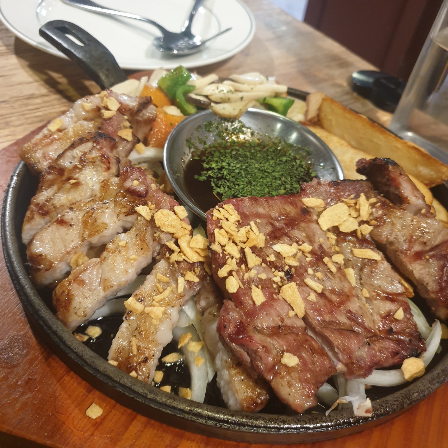 목살과 삼겹살 스테이크예요.