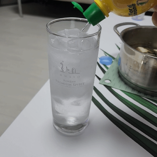 저는 화요와 토닉워터 비율을 1:2로 탔으며 마무리로 레몬즙을 넣었습니다.
