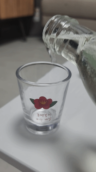매화수의 매화와 잘 어울릴 것 같은 제주도에서 물건너온 동백꽃 잔에 따라줍니다.