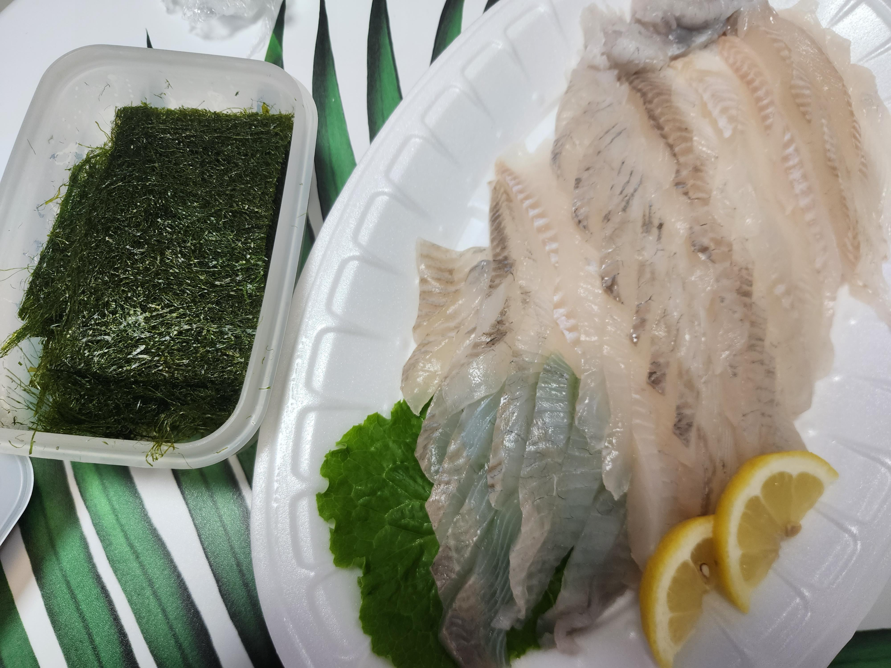 마지막으로 오늘의 안주 도다리회와 감태입니다.
