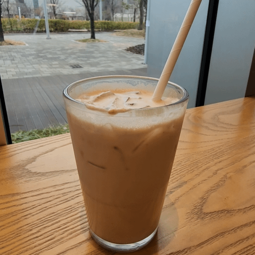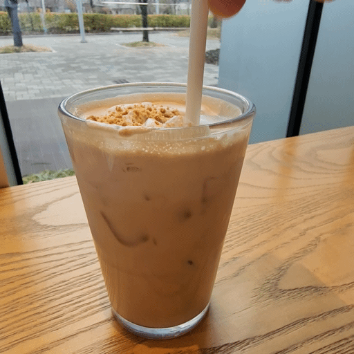 이제 섞은 에스프레소 쿠키 라떼를 한 모금해 봅니다.