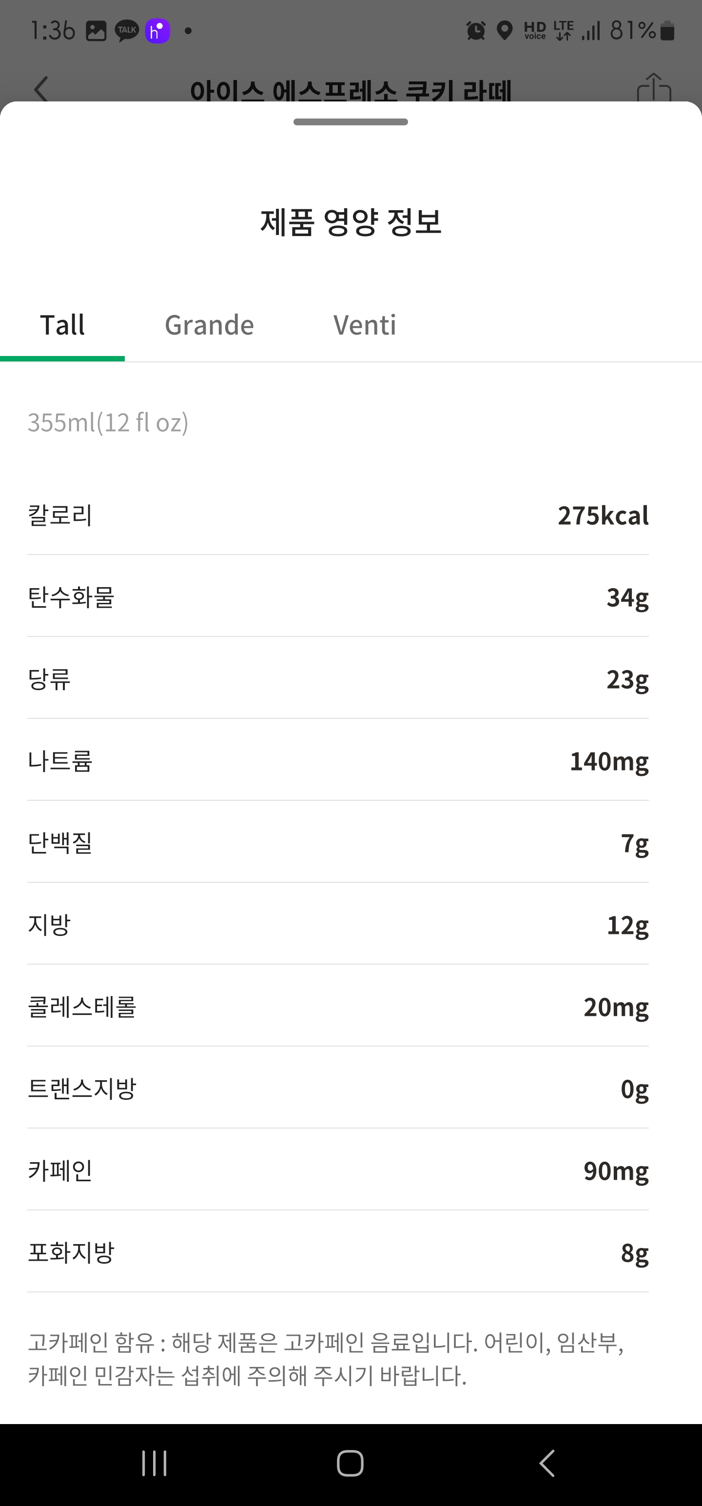 에스프레소 쿠키 라떼 영양 정보입니다.