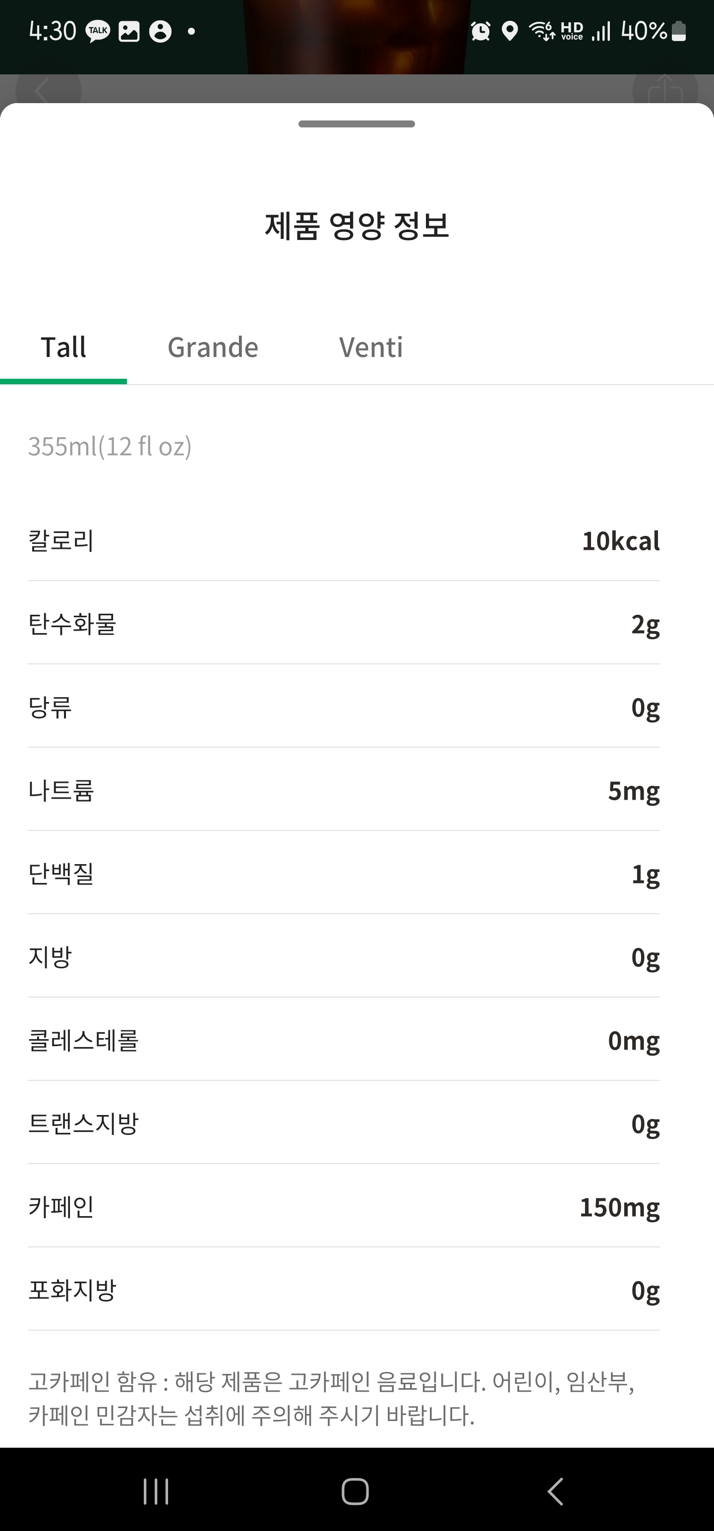 카페인이 너무 높길래 스타벅스의 다른 아메리카노와 카페라떼의 카페인을 비교해 봤는데요.