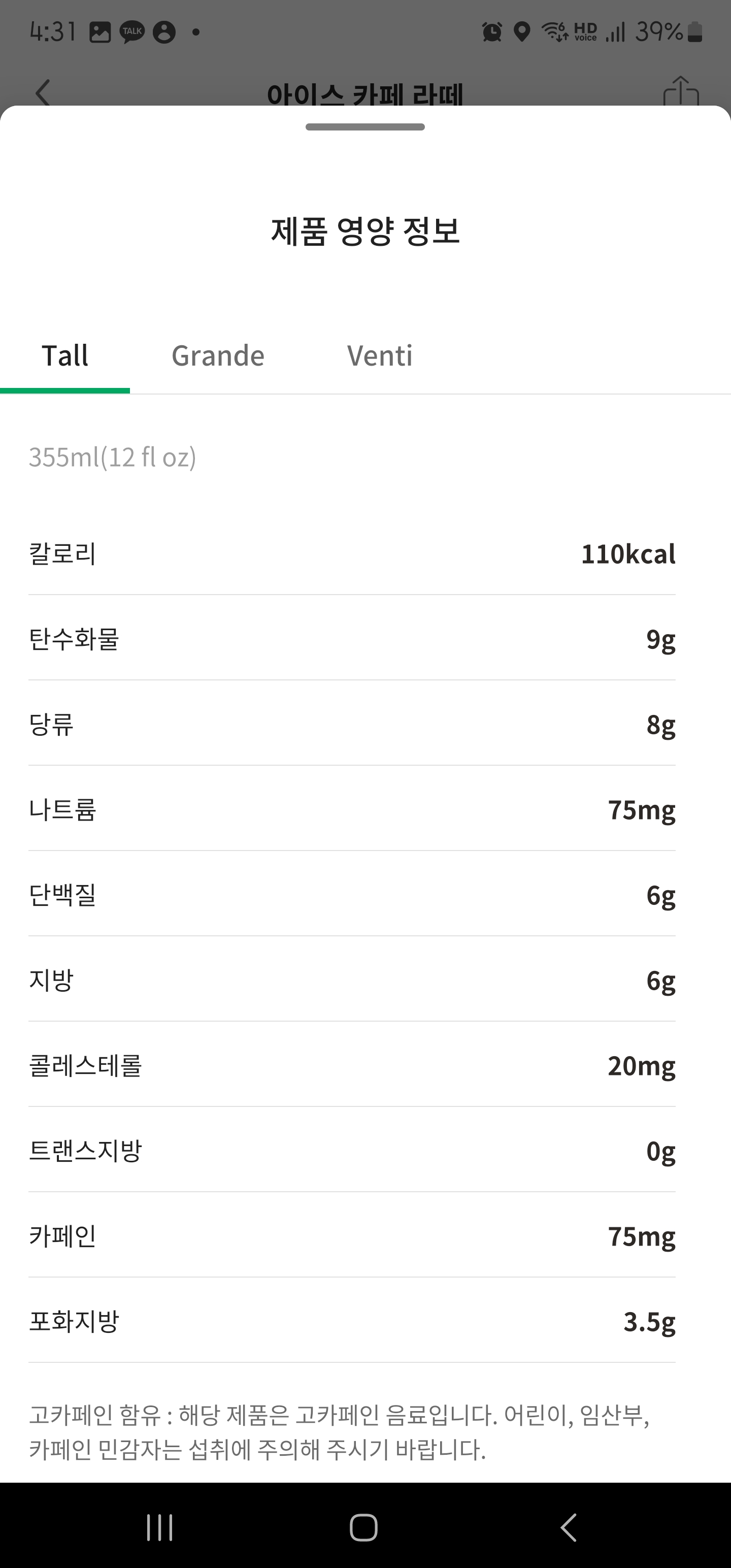 스타벅스 카페라떼의 경우 카페인이 75입니다.