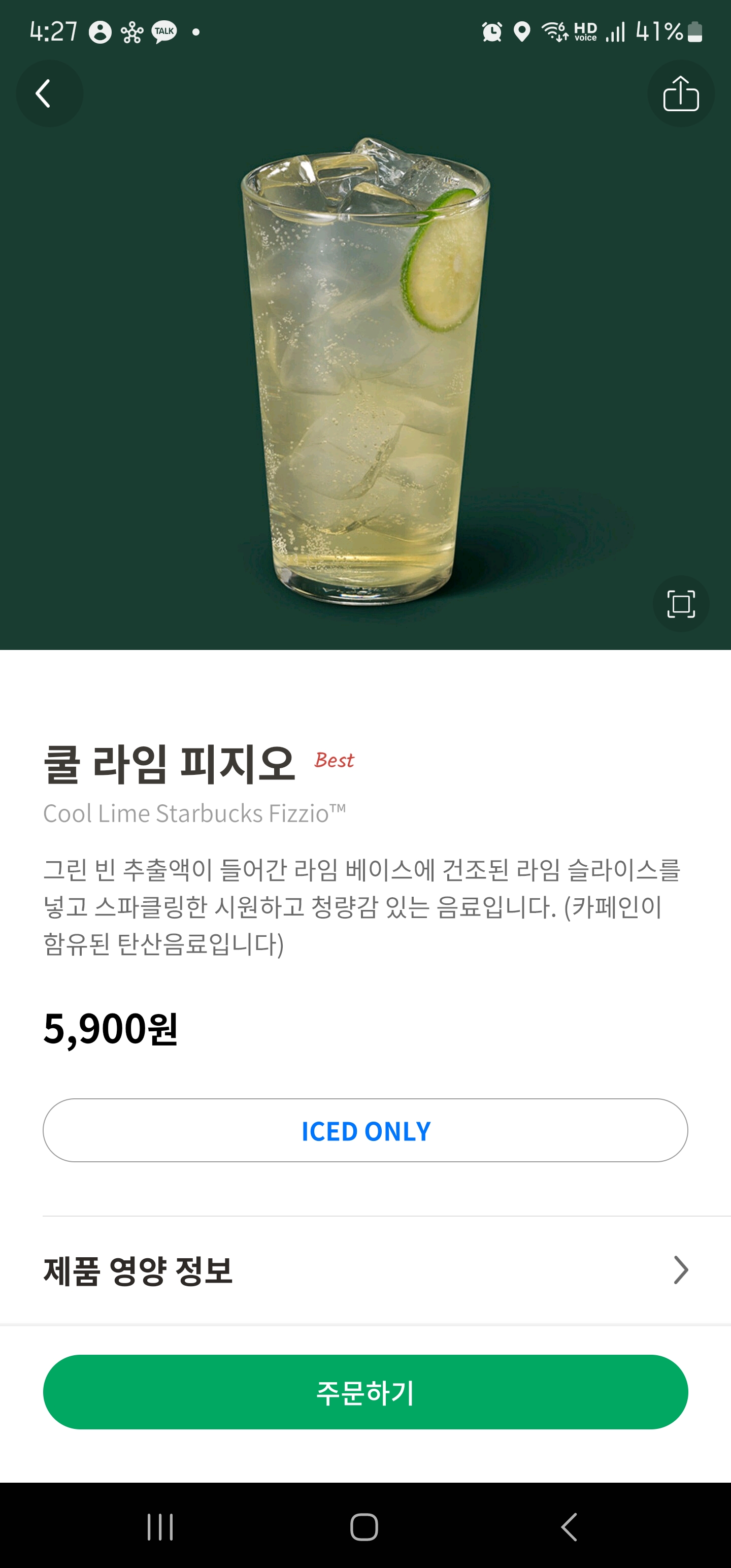 그린 빈 추출액이 들어간 라임 베이스에 건조된 라임 슬라이스를 넣고 스파클링 한 시원하고 청량감 있는 음료라고 하네요.