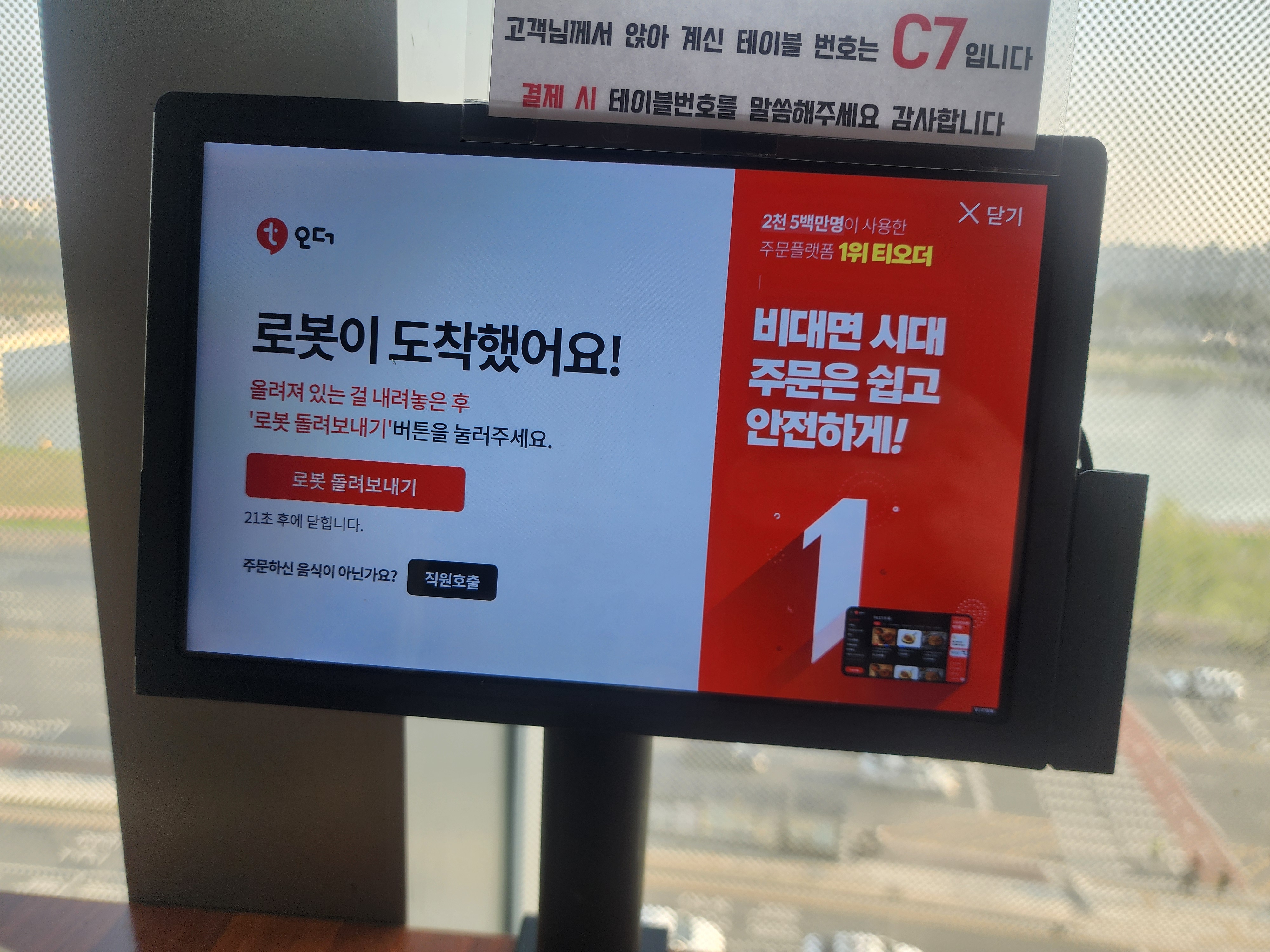 먹다가 단무지가 부족하여 요청을 했는데 로봇이 배달이 오는 것 같습니다.