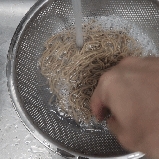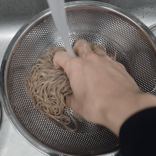 4분 동안 면을 잘 삶았으면 이제 찬물에 씻을 차례입니다.