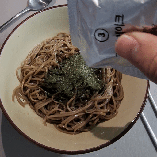 이제 다시 한번 비벼서 먹으려고 하는데 김 후레이크가 면 사이사이에 달라붙습니다.