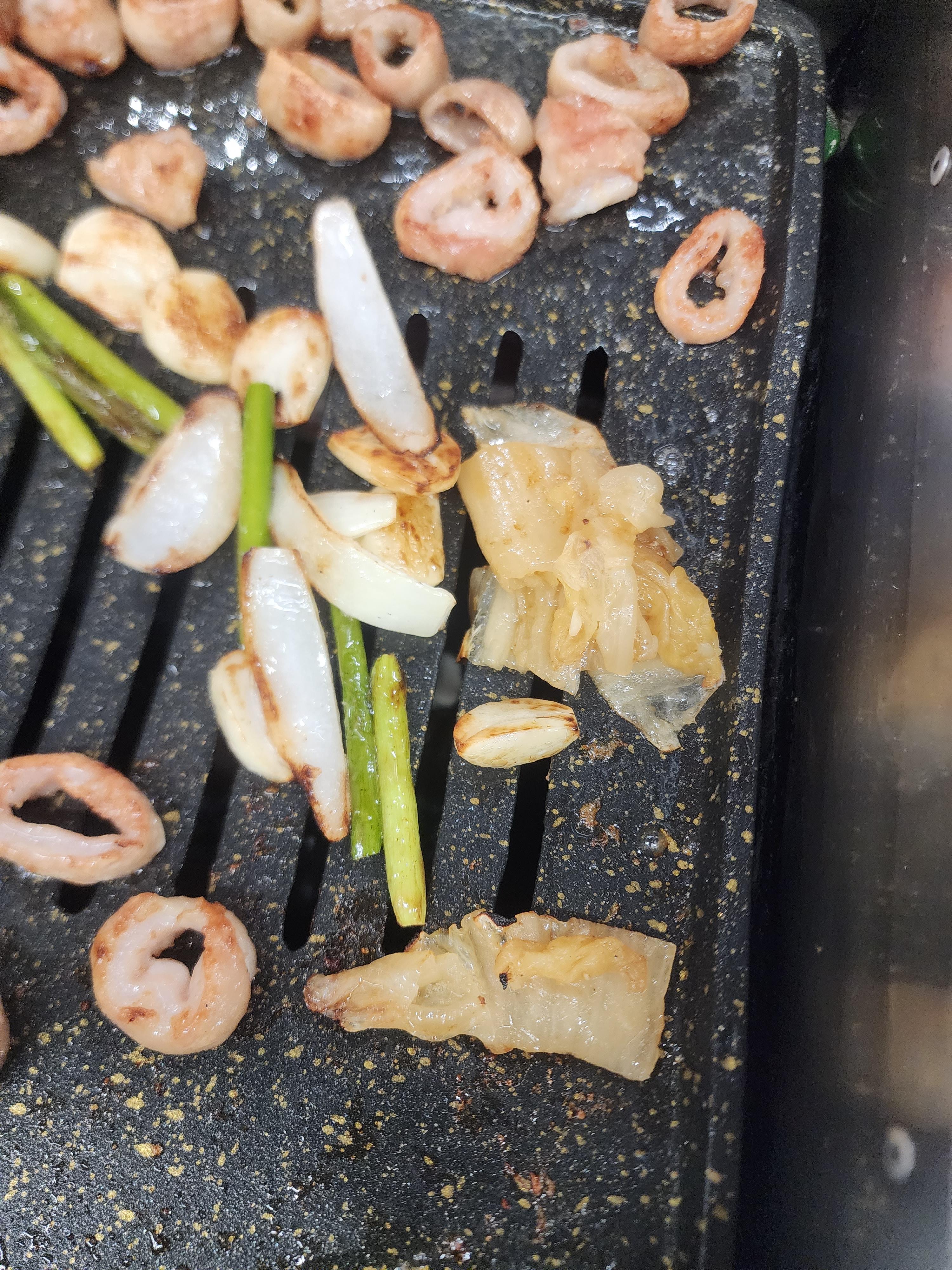 어느 정도 막창이 구워지면 아주머님이 마늘쫑, 양파, 마늘을 넣어줍니다.
