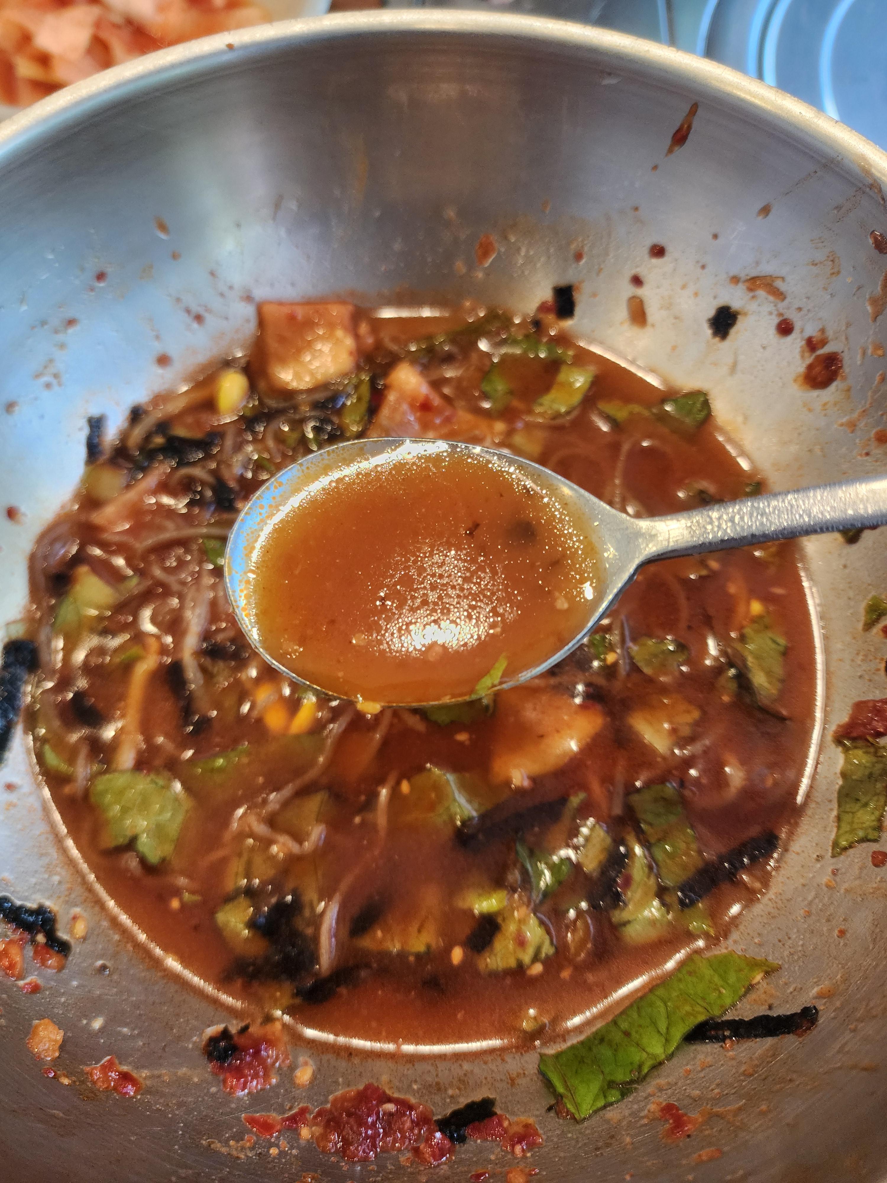 그릇에 붙어 있는 소스를 싹싹 모아서 육수에 잘 섞어줍니다.