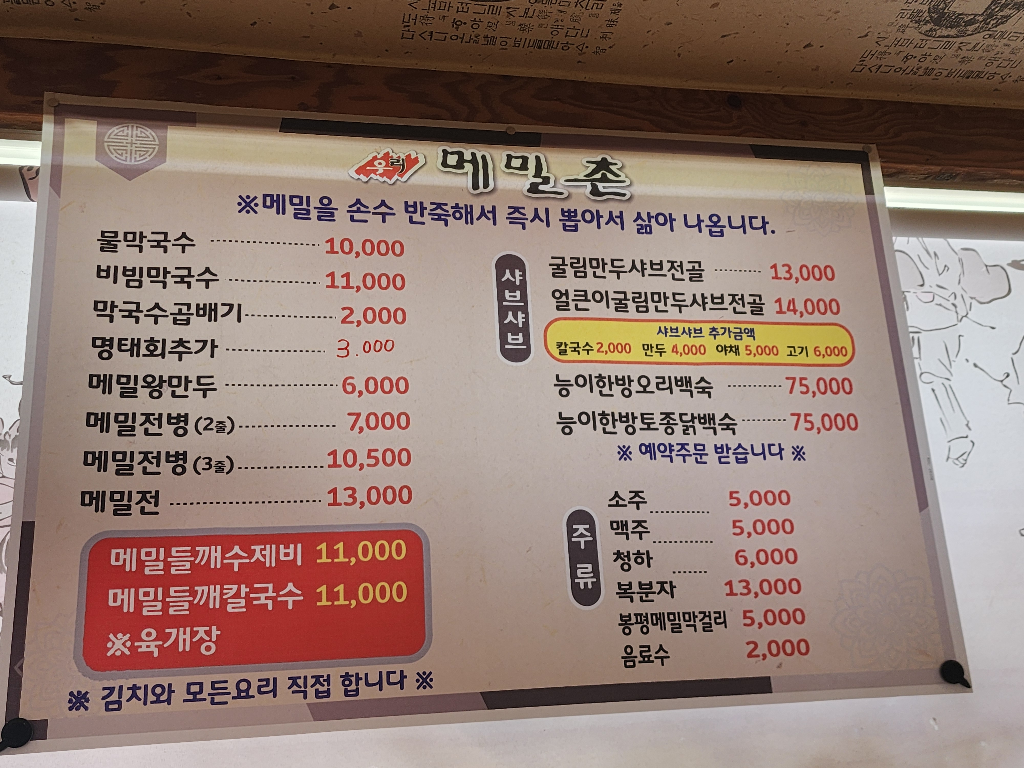 우리 메밀촌 메뉴 및 가격입니다.