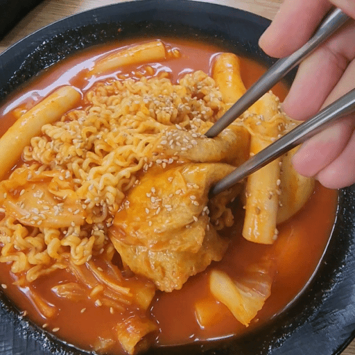 어묵, 쌀떡, 양배추, 계란 그리고 라면이 들어가 있습니다.