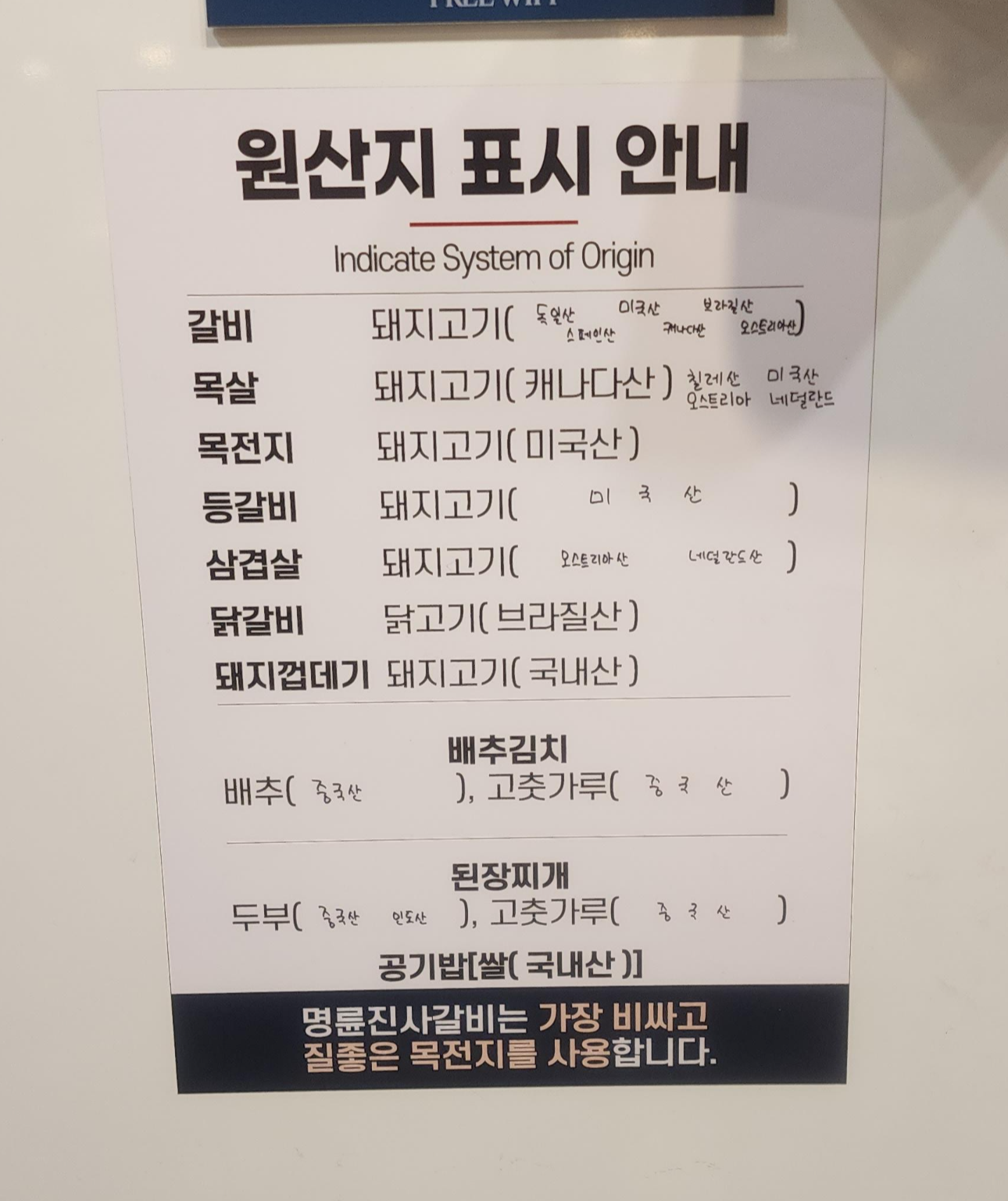 명륜진사갈비 원산지 정보입니다.