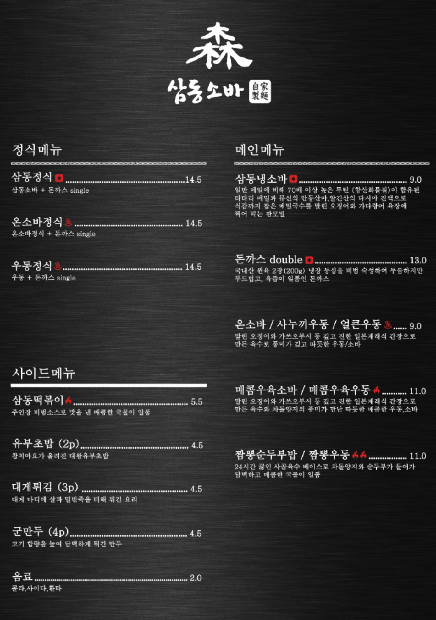 삼동소바 메뉴 및 가격입니다.