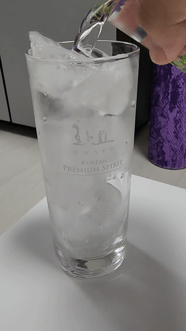잔에 따른 소주를 얼음 가득 채운 하이볼 잔에 넣어줍니다.