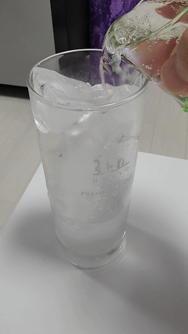 이제 토닉워터 와일드 피치를 따른 잔을 하이볼 잔에 부어주면 됩니다.