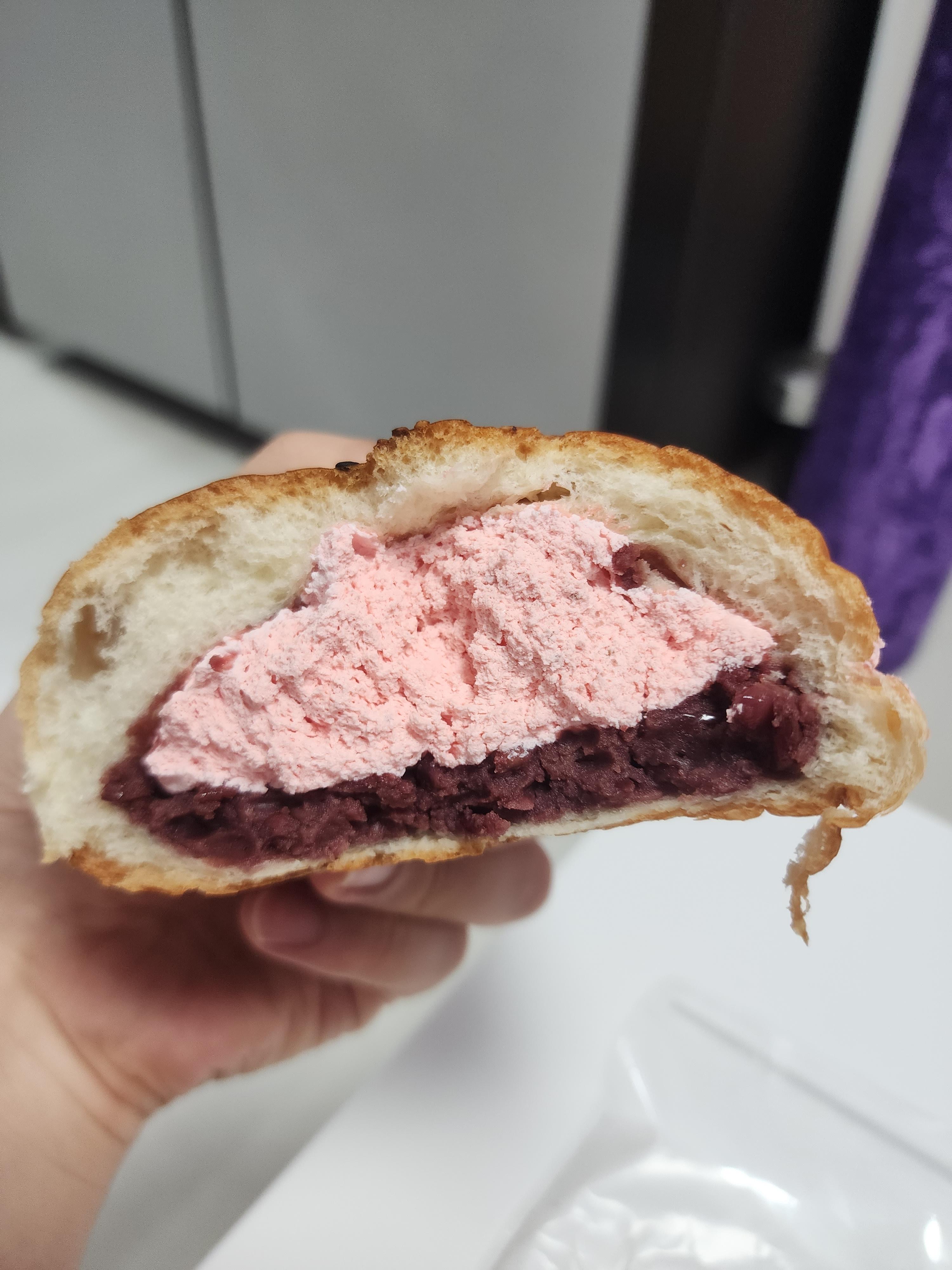딸기 생크림 단팥빵을 한 입 크게 먹었는데요.