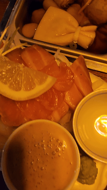 연어 사시미를 소스에 푹 찍어서 한 점 먹었습니다.