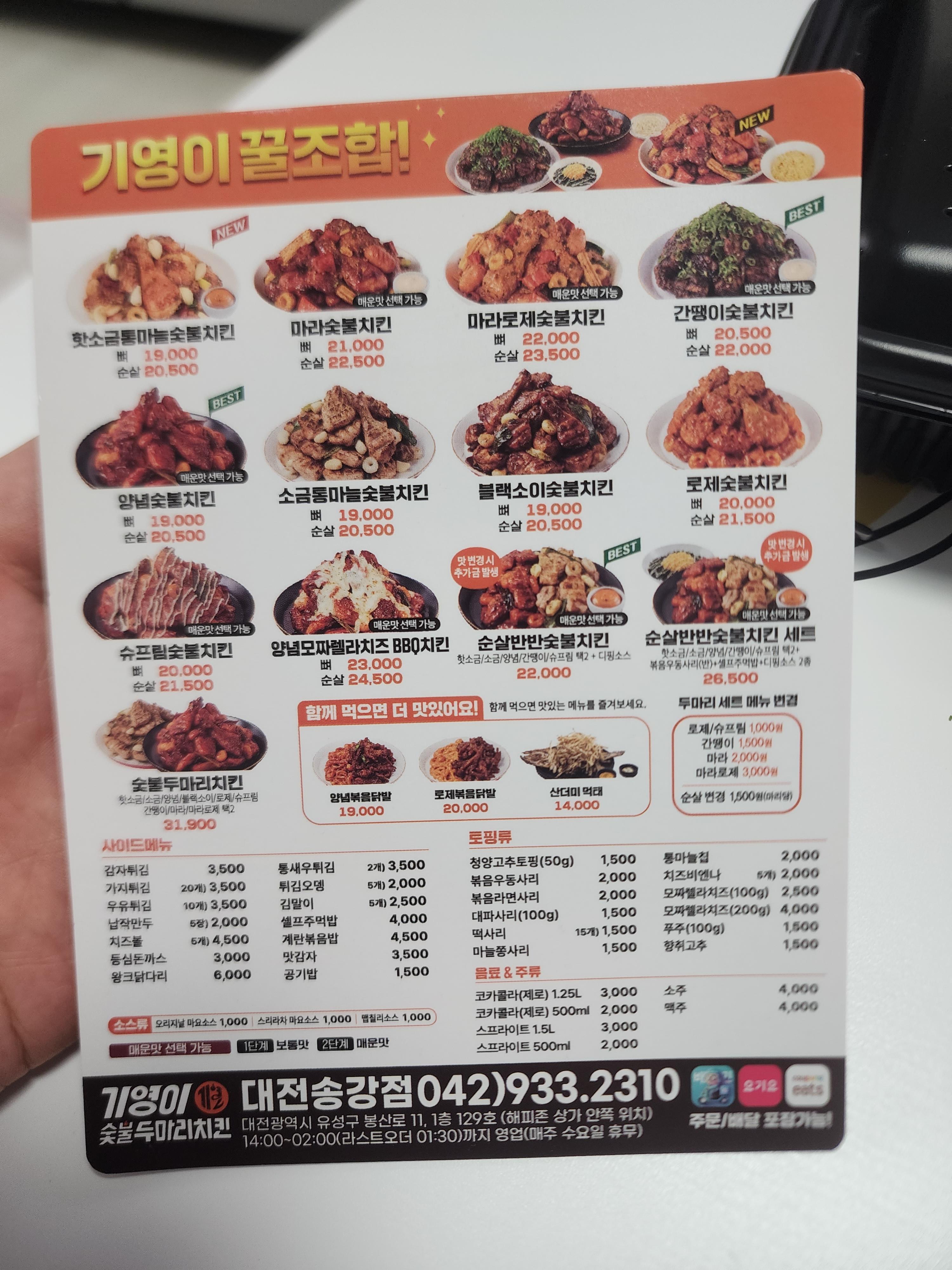 기영이 숯불 두 마리 치킨 메뉴 및 가격입니다.
