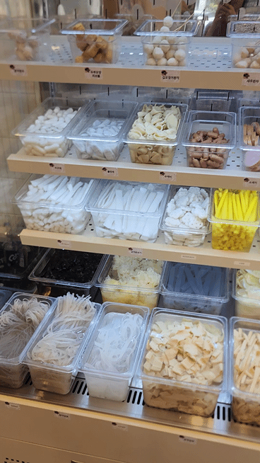 꼬치 한 개와 버섯 종류 별로 담고 연근과 숙주 등등을 담습니다.