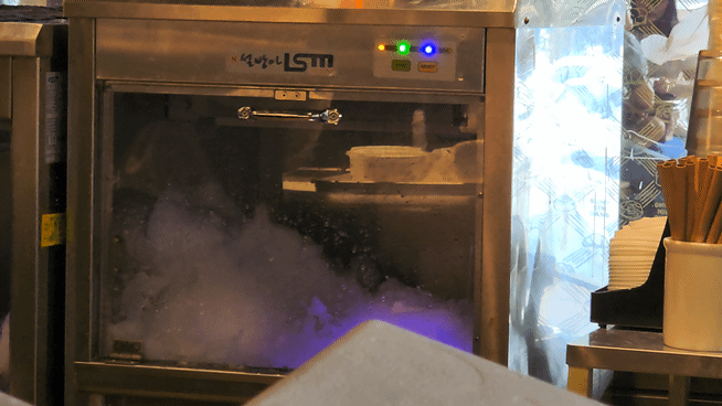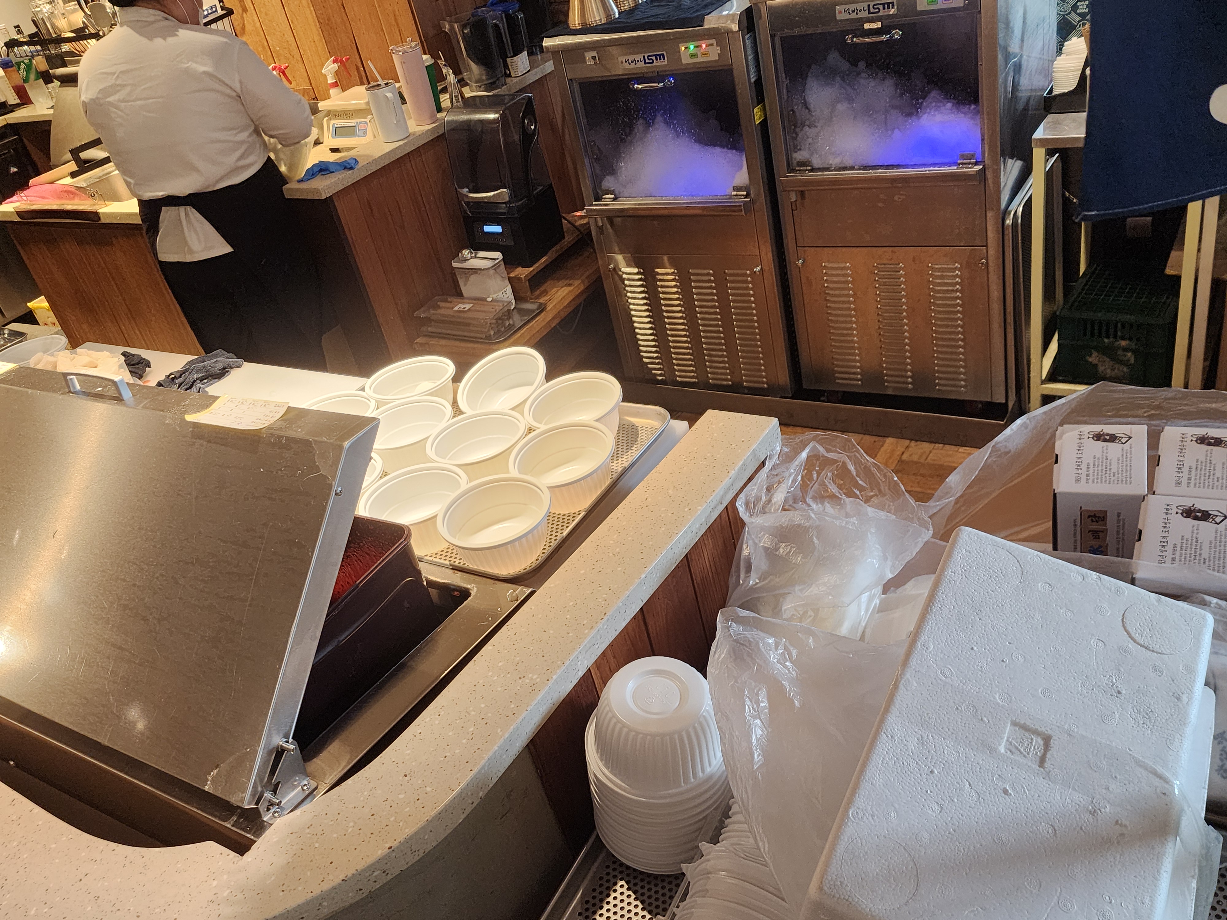 한쪽에선 빙수 얼음을 계속 만들고 빨리 포장을 하기 위해 그릇을 미리 세팅해 두셨습니다.