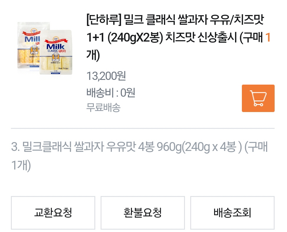 밀크 클래식 쌀과자 우유맛으로 4봉 구매했습니다.