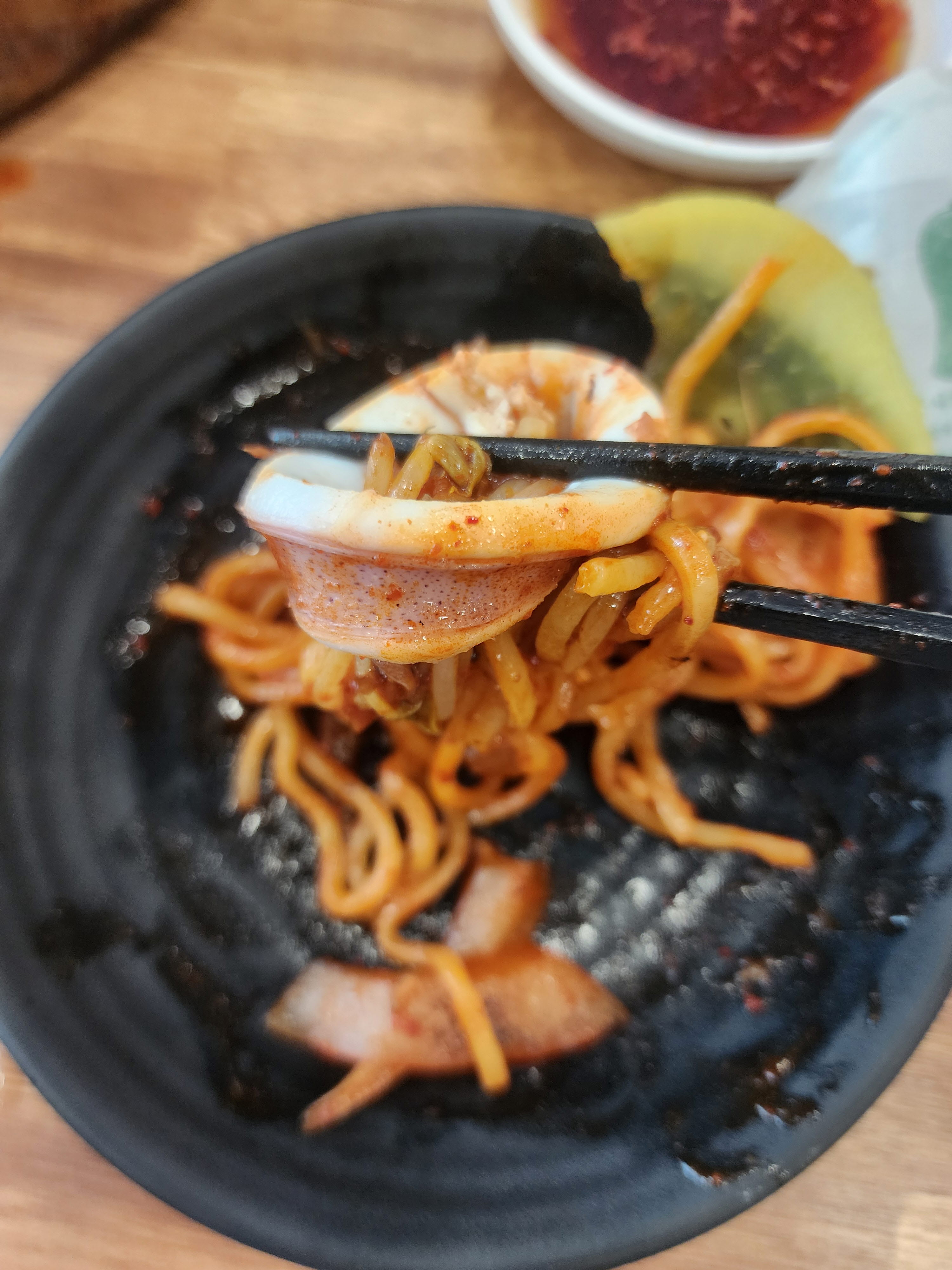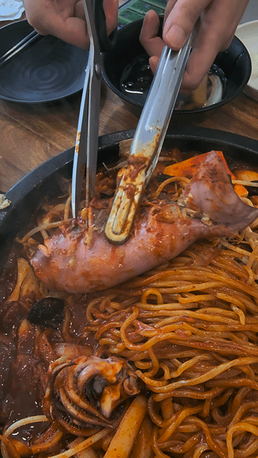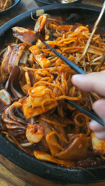 면과 오징어, 새우 등 해산물을 같이 퍼서 먹어줍니다.