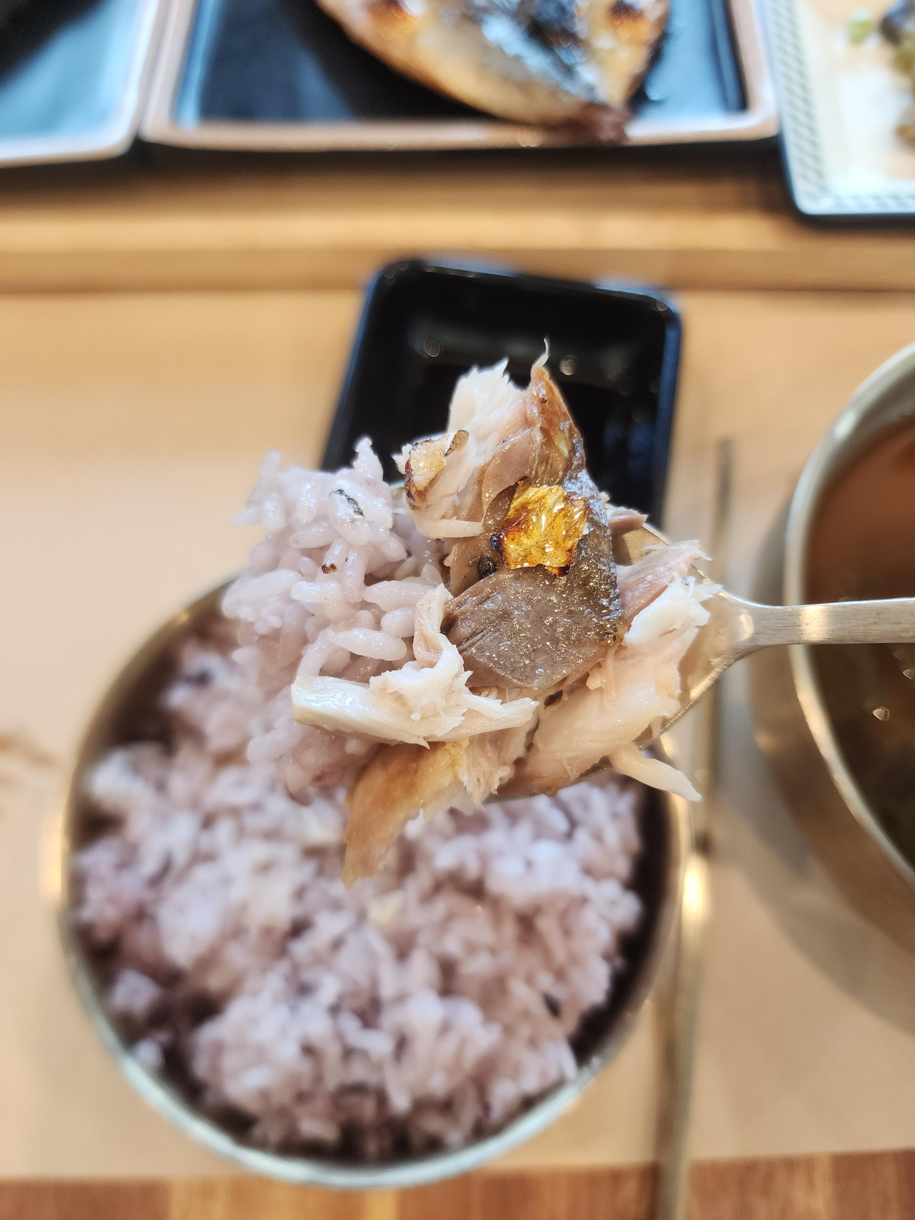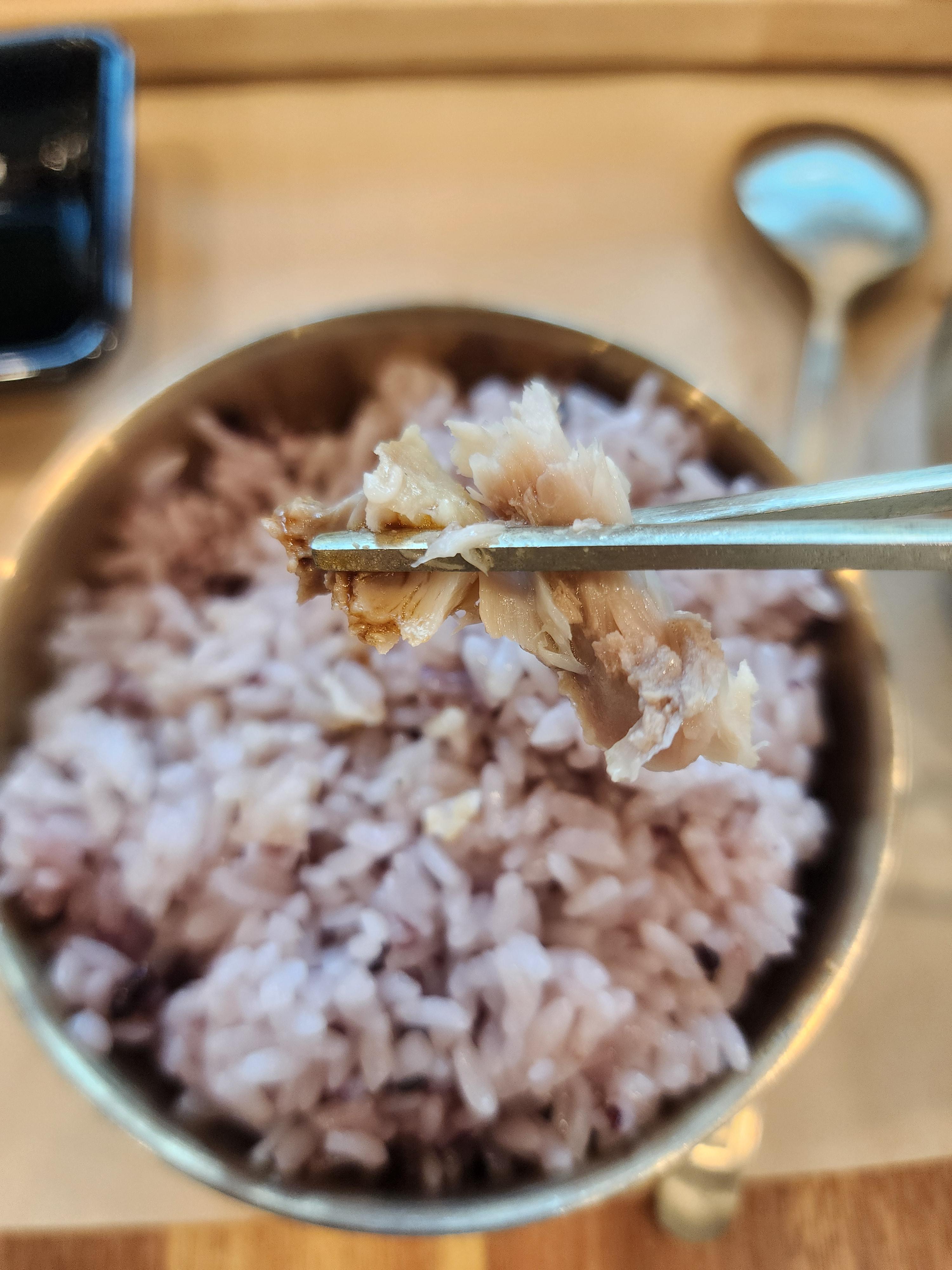 바로 숟가락 교체 후 야무지게 밥과 고등어를 올려줬습니다.