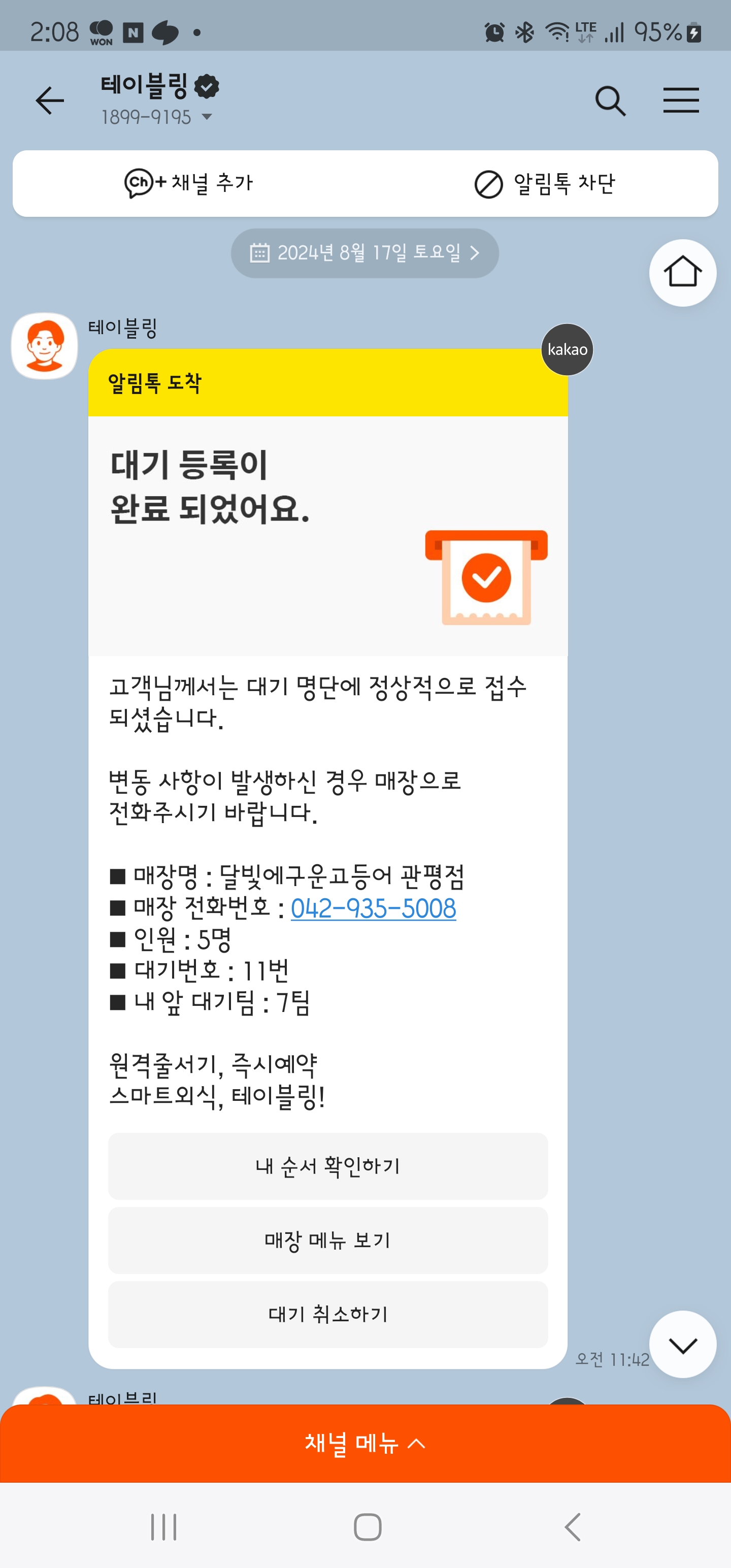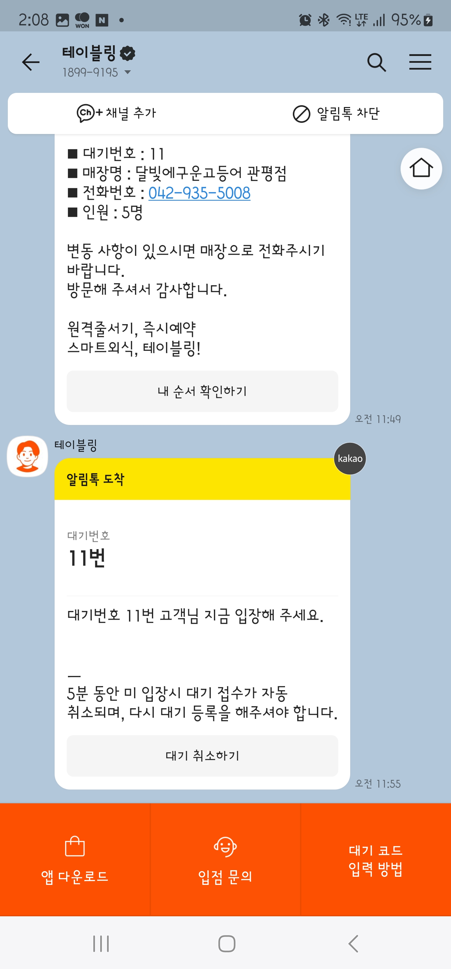 테이블링 알림 시간으로 13분 걸렸네요.