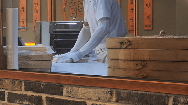 용자1은 식당 가운데에 직접 면을 반죽하는 모습을 볼 수 있습니다.