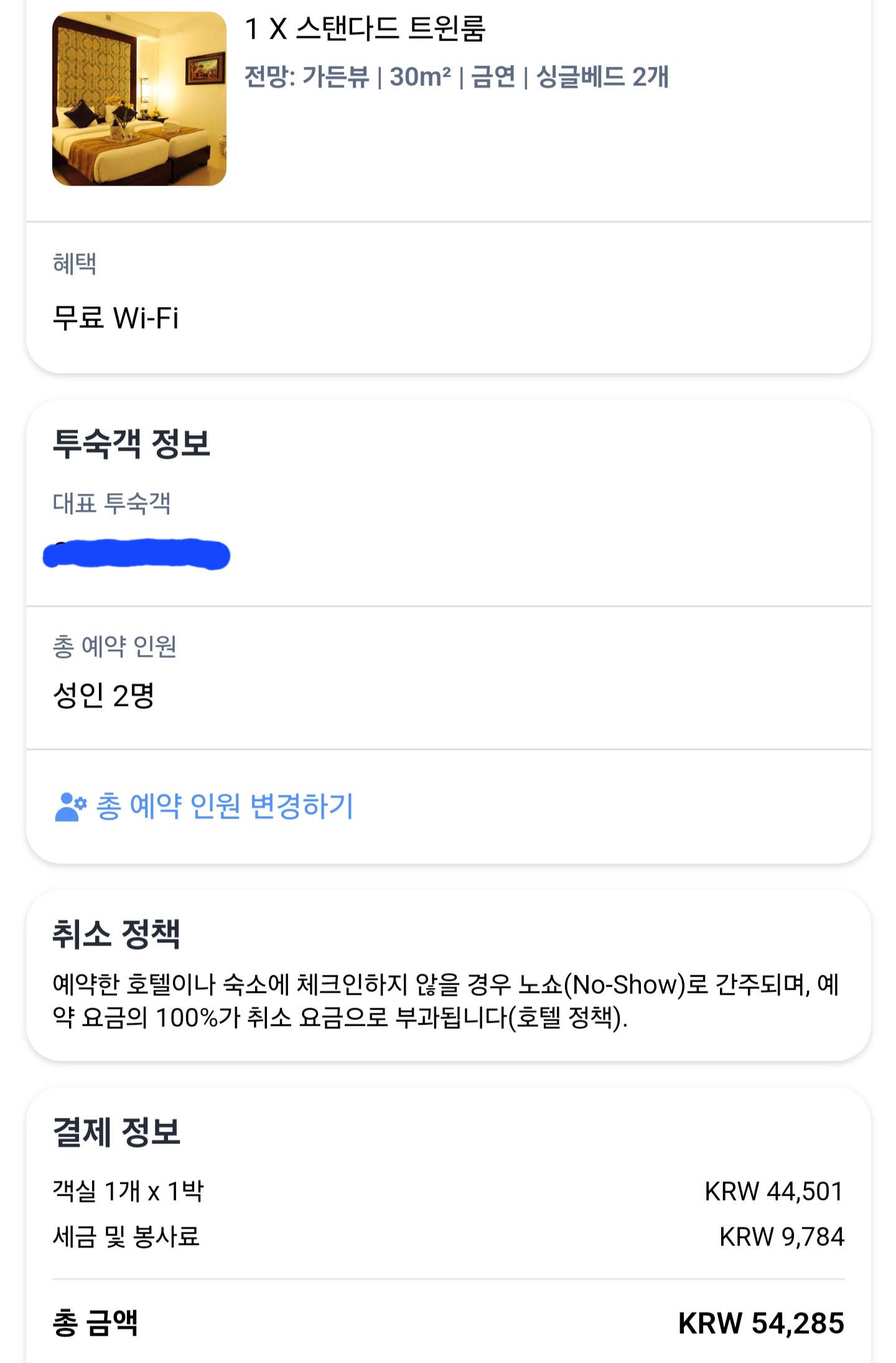 스탠다드 트윈룸 2명 기준 54,285원에 예약을 했습니다.