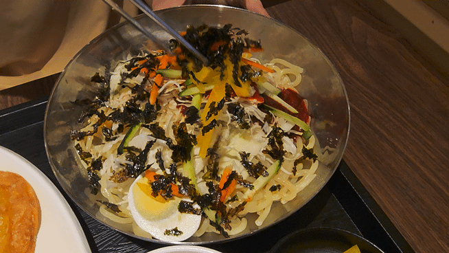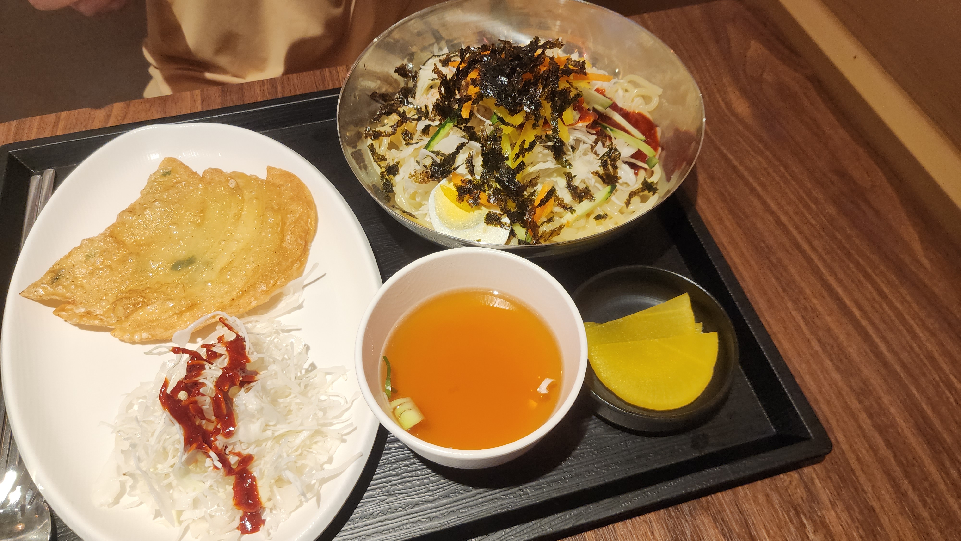양배추와 단무지, 오이, 당근 등이 고명으로 올라가 있네요.