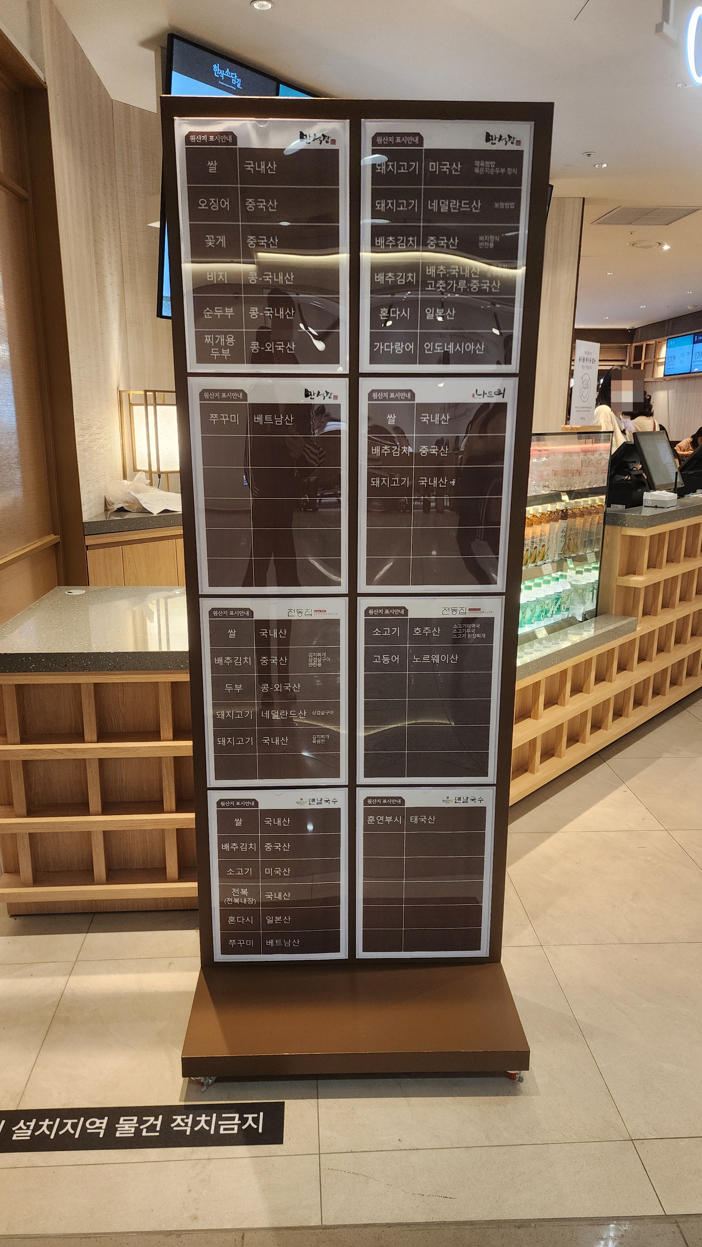 한식소담길 식당 별 원산지 정보입니다.