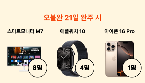 21일을 다 채울 경우 스마트모니터, 애플워치 10, 아이폰 16 pro에 응모가 됩니다!!