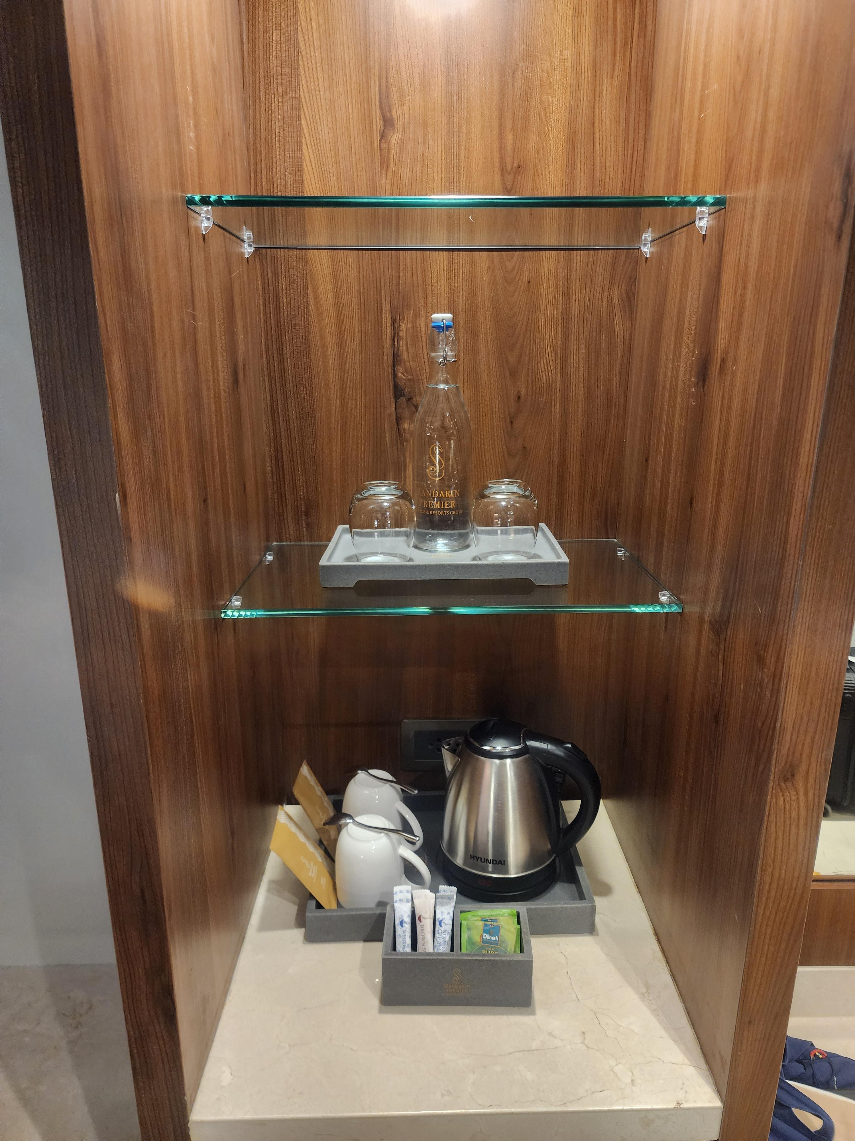 물 두 개와 드립백, 차, 커피포트가 있습니다.