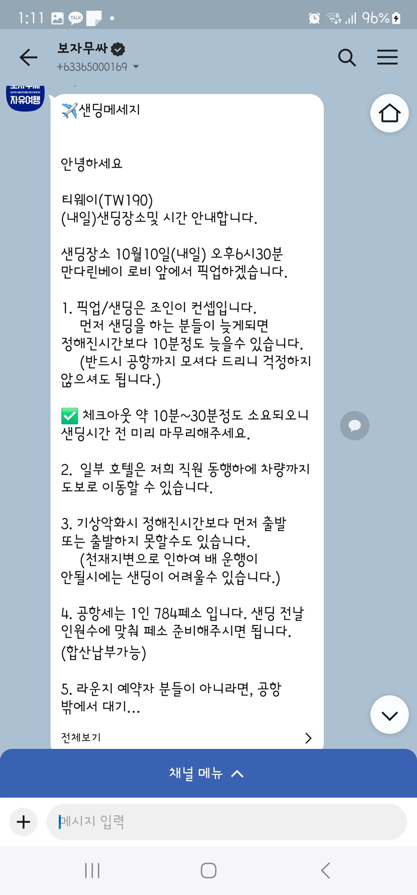 보라카이에서 인천공항으로 떠나기 하루 전에 샌딩 관련 메시지가 옵니다.