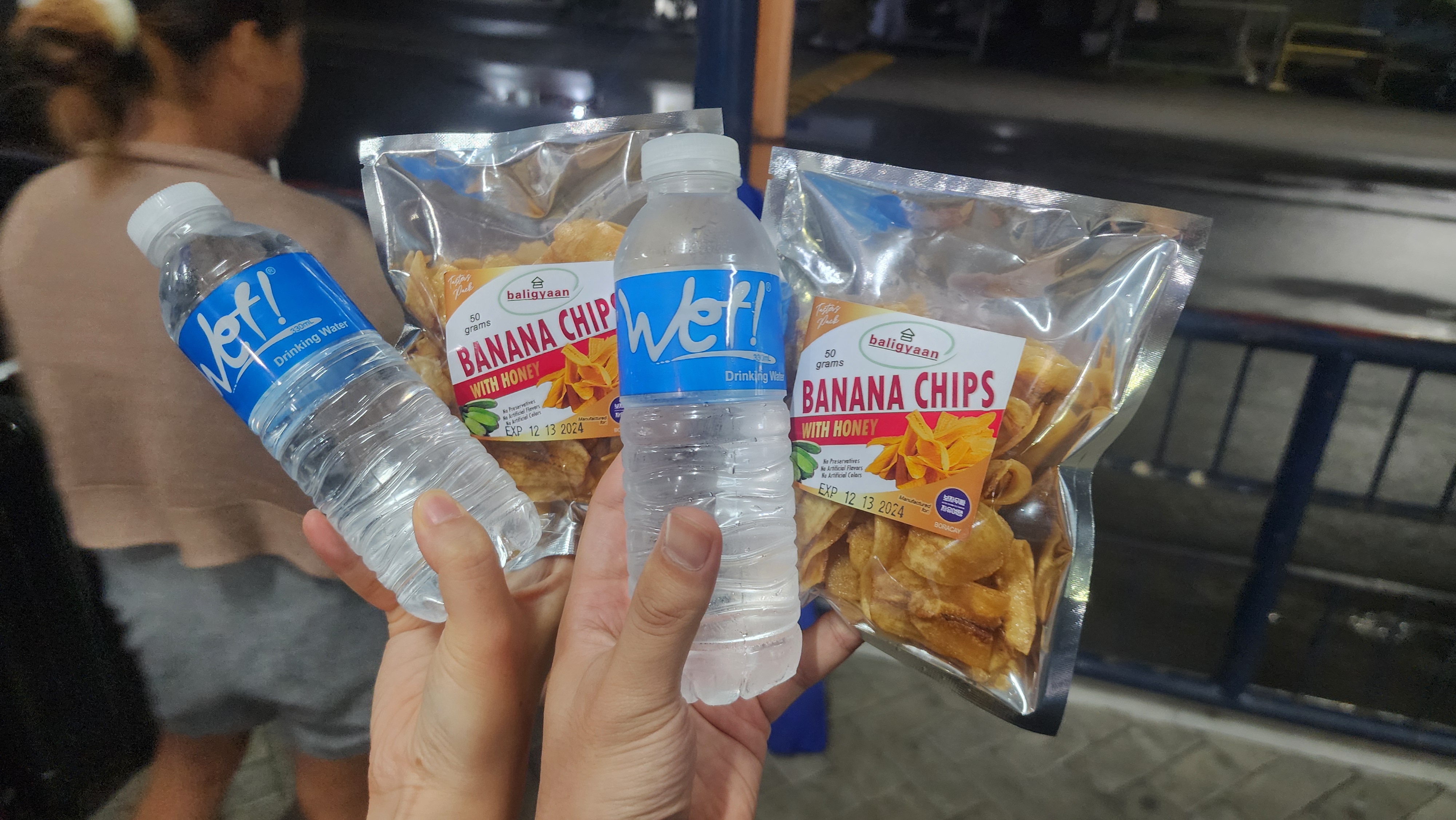 명단을 확인하고 물과 바나나 칩을 주시는데 바나나 칩이 정말 맛있었습니다.