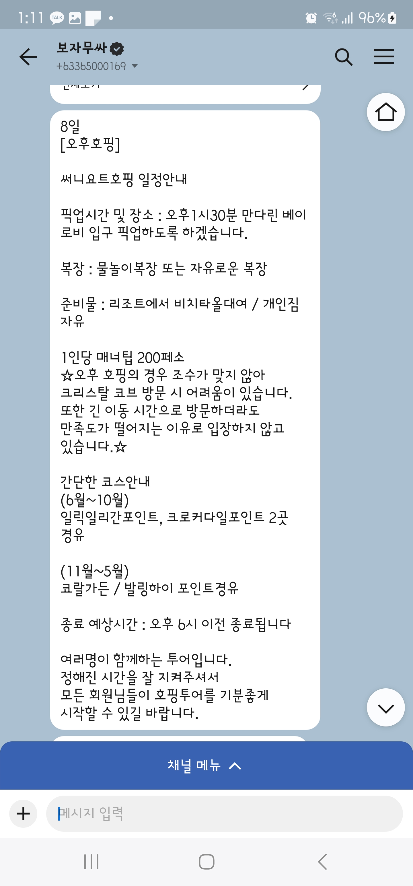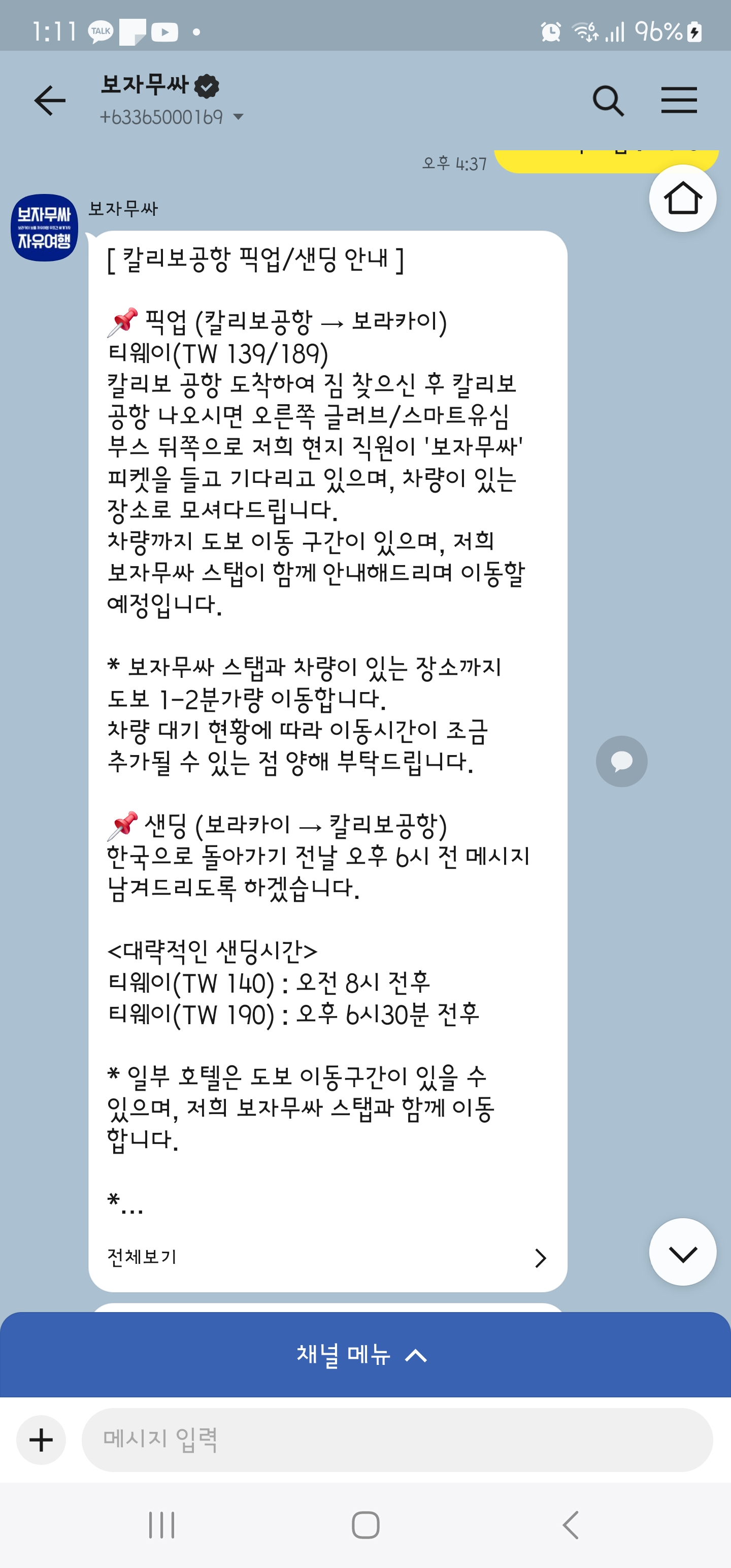 먼저 한국에서 보라카이로 출발하기 1일 전에 보자무싸에 카톡으로 연락을 합니다.