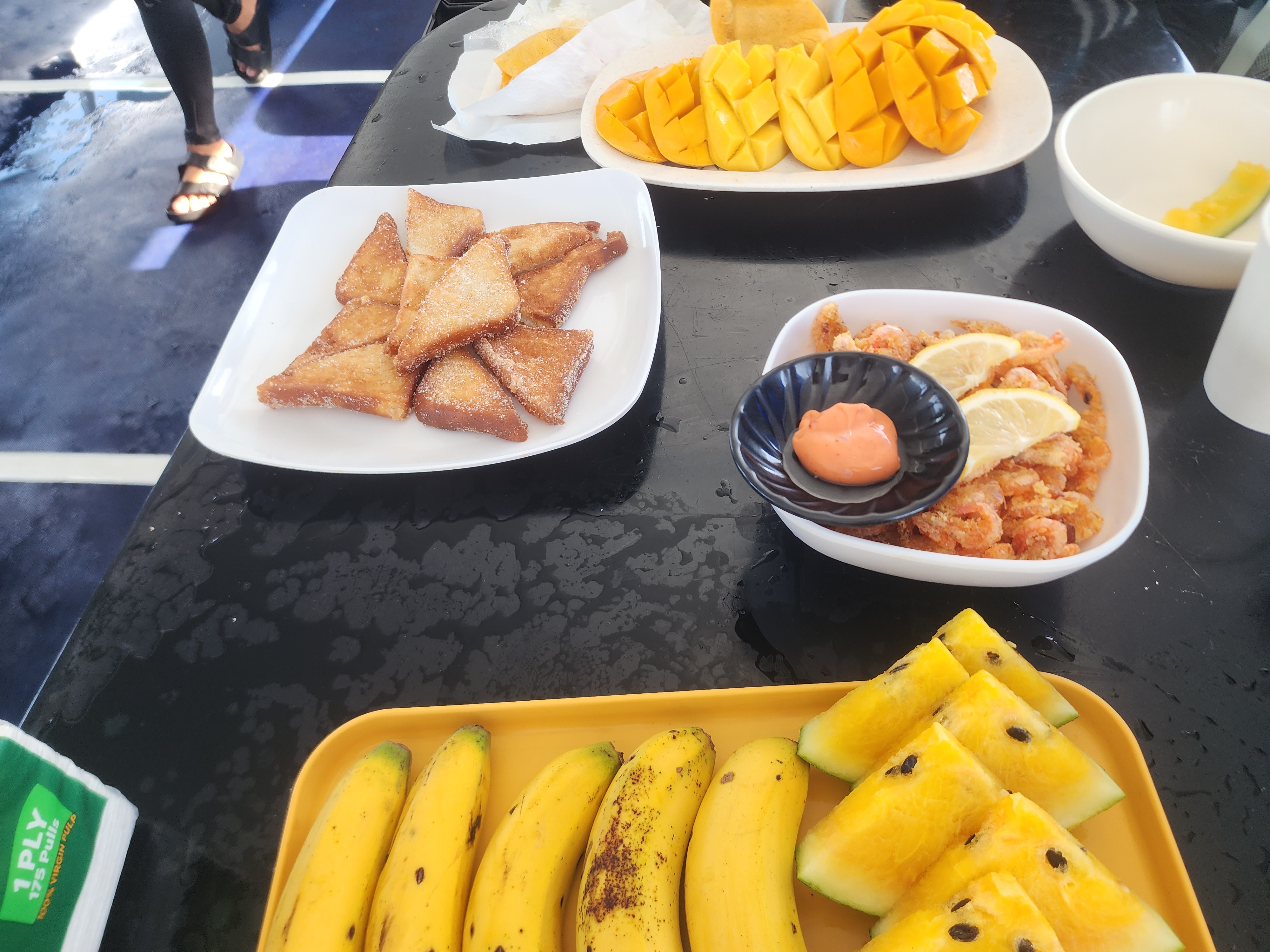 새우도 먹고 싶긴 했는데 젓가락을 안 주셔서 그냥 망고와 식빵 위주로 먹었습니다.