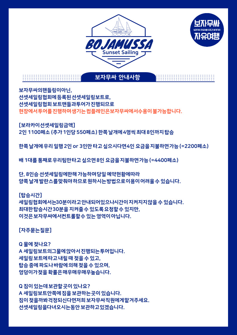 해당 투어는 보자무싸에서 진행하기보단 삐끼 없이 선셋세일링 업체와 연결을 해주는 것이라고 합니다.