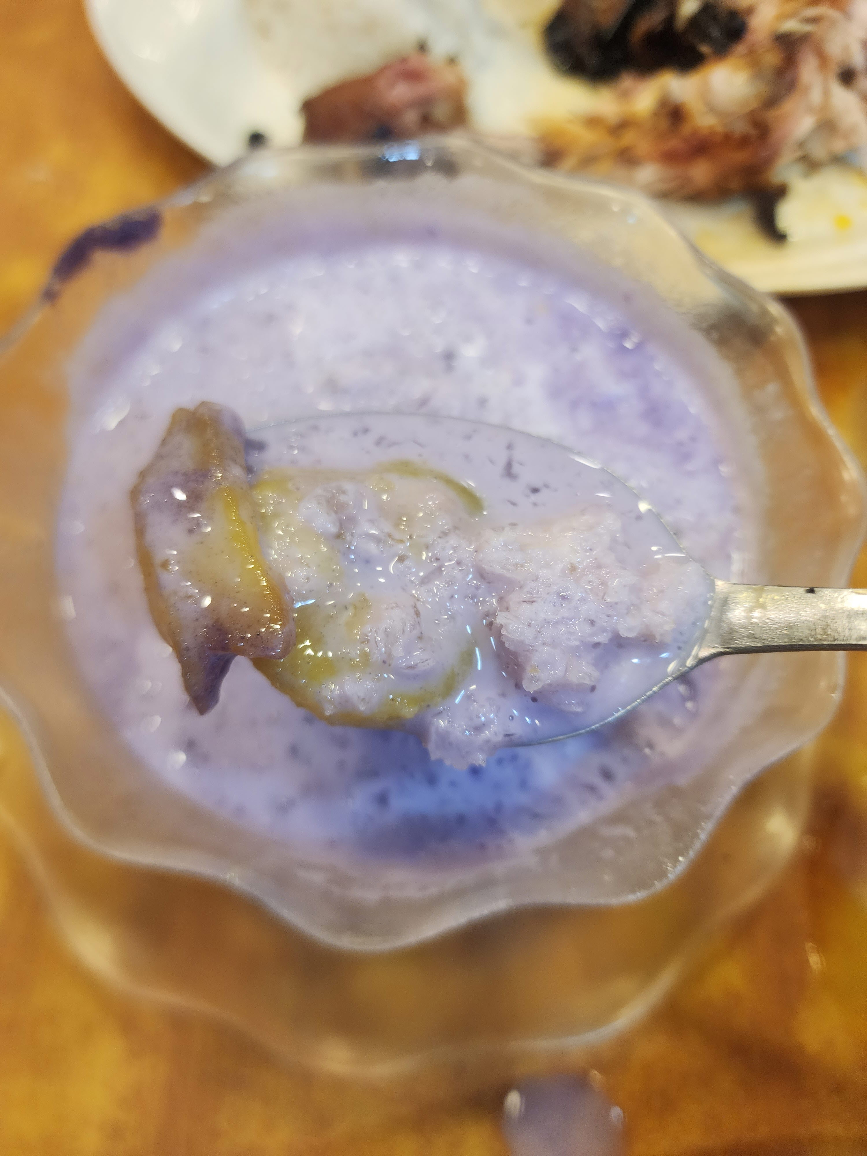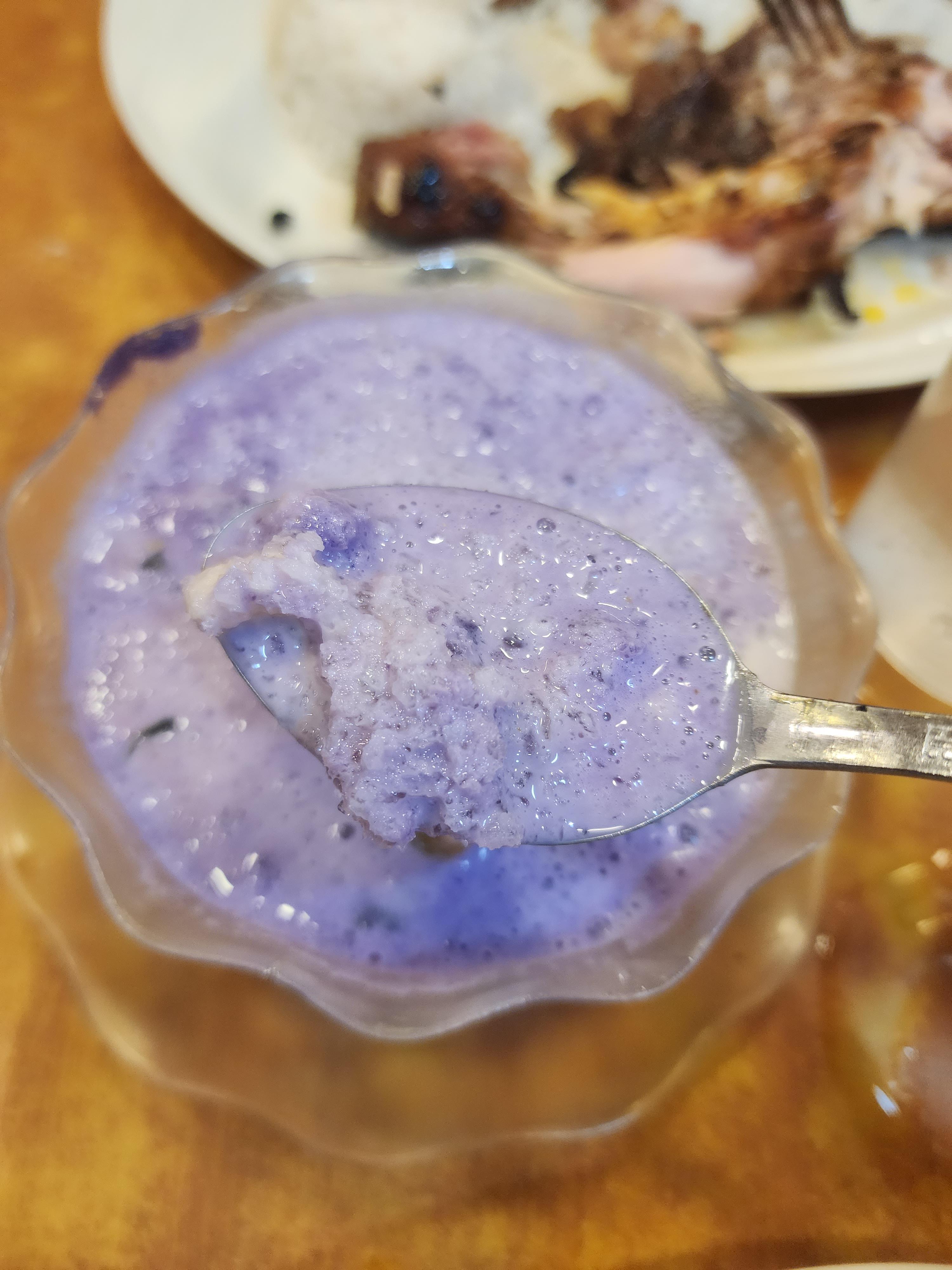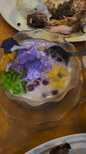 밥과 닭고기를 다 먹고 할로할로를 먹어보려고 하는데요.