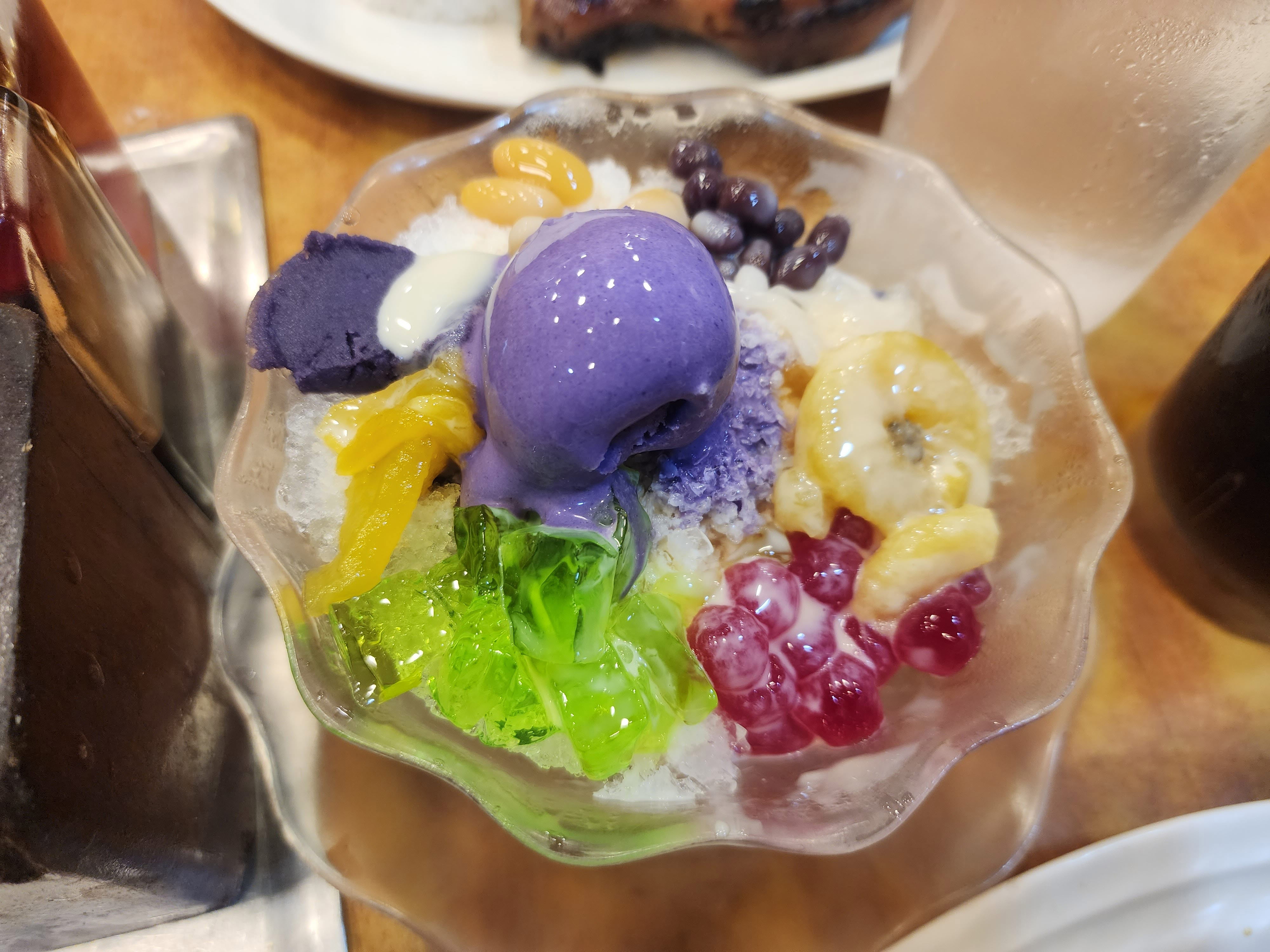 간 얼음 위에 타로 아이스크림과 젤리 같은 게 올라가 있습니다.